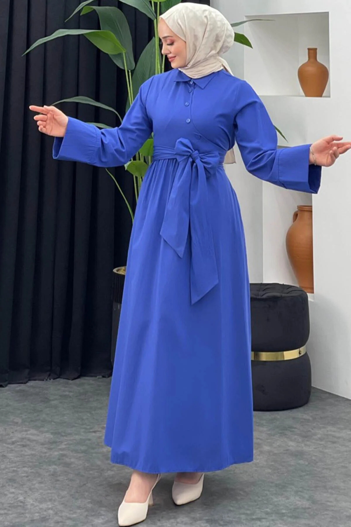 Kadın Bağlama Detaylı Gömlek Elbise- Saks Mavi (TD279)