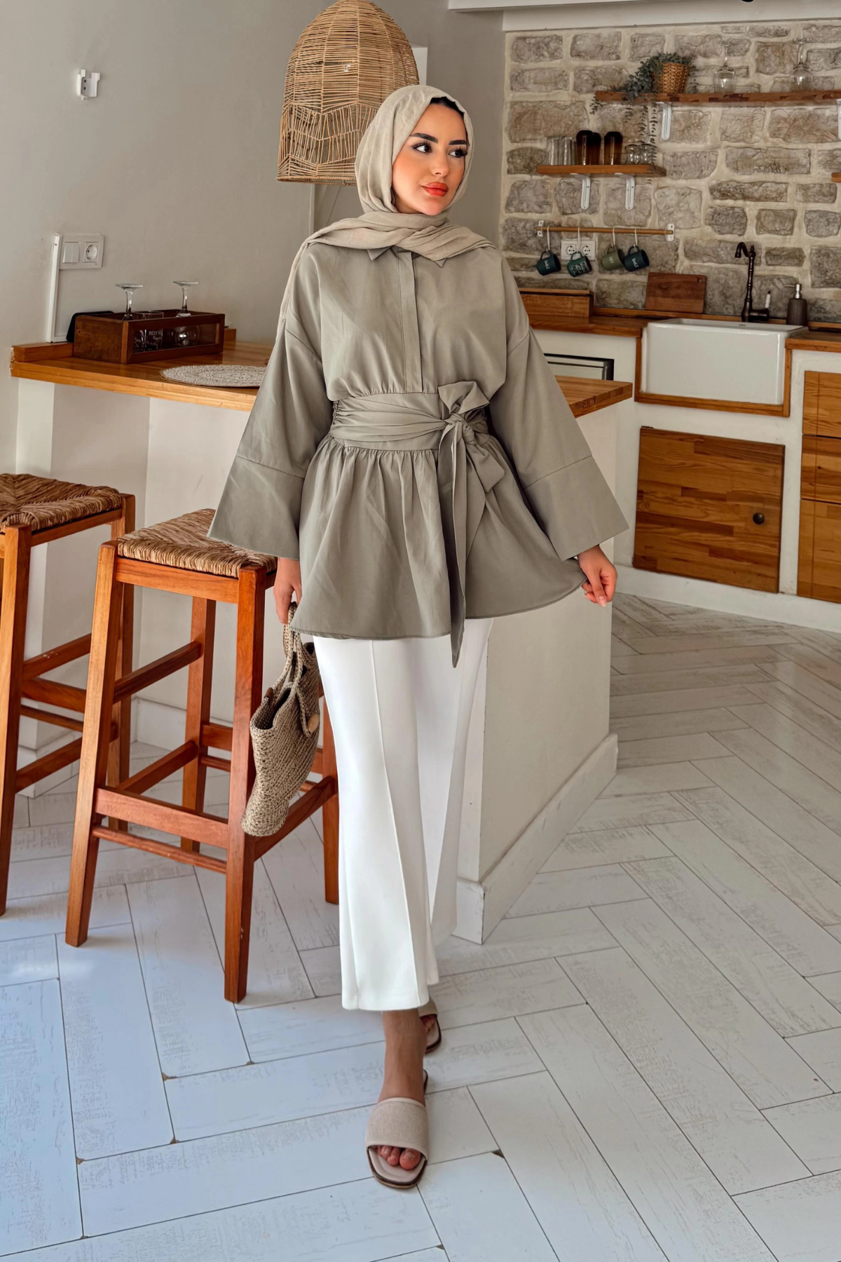 Kadın Bağlama Detaylı Rozi Gömlek - Haki (TD144)