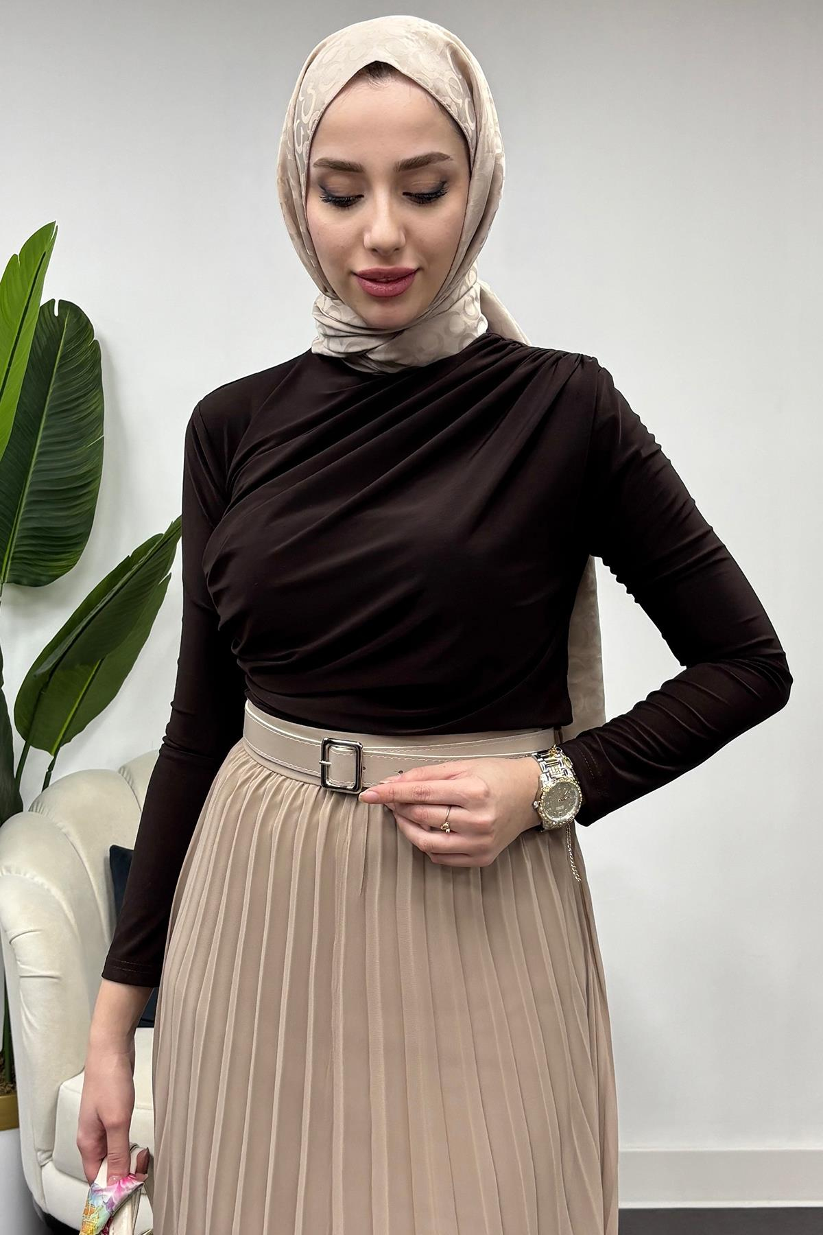 Kadın Büzgü Detaylı Dik Yaka Sandy Bluz -Kahve (TD065)