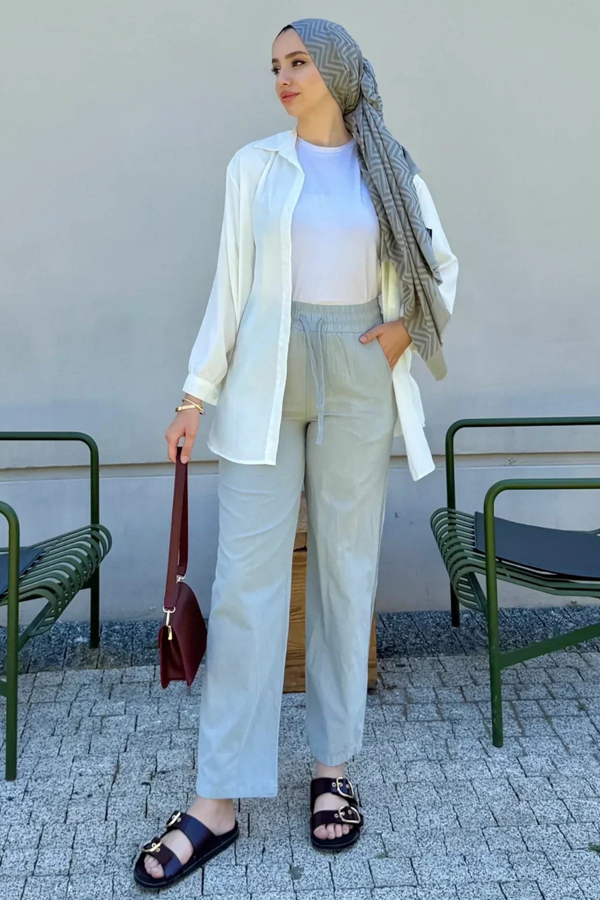 Kadın Keten Kumaş Cepli Beli Lastikli Pantolon- Gri