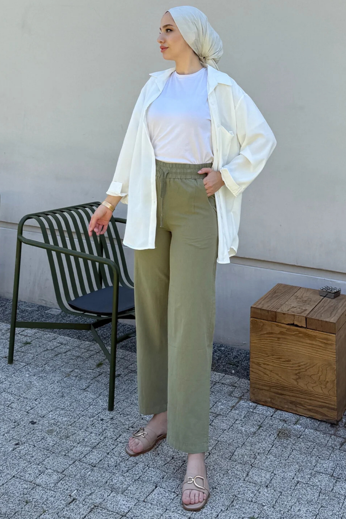 Kadın Keten Kumaş Cepli Beli Lastikli Pantolon- Haki (TD196)