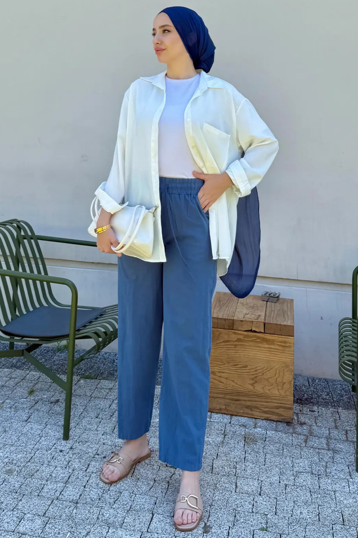 Kadın Keten Kumaş Cepli Beli Lastikli Pantolon- İndigo (TD196)