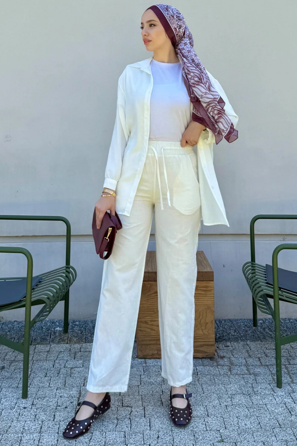 Kadın Keten Kumaş Cepli Beli Lastikli Pantolon- Krem (TD196)