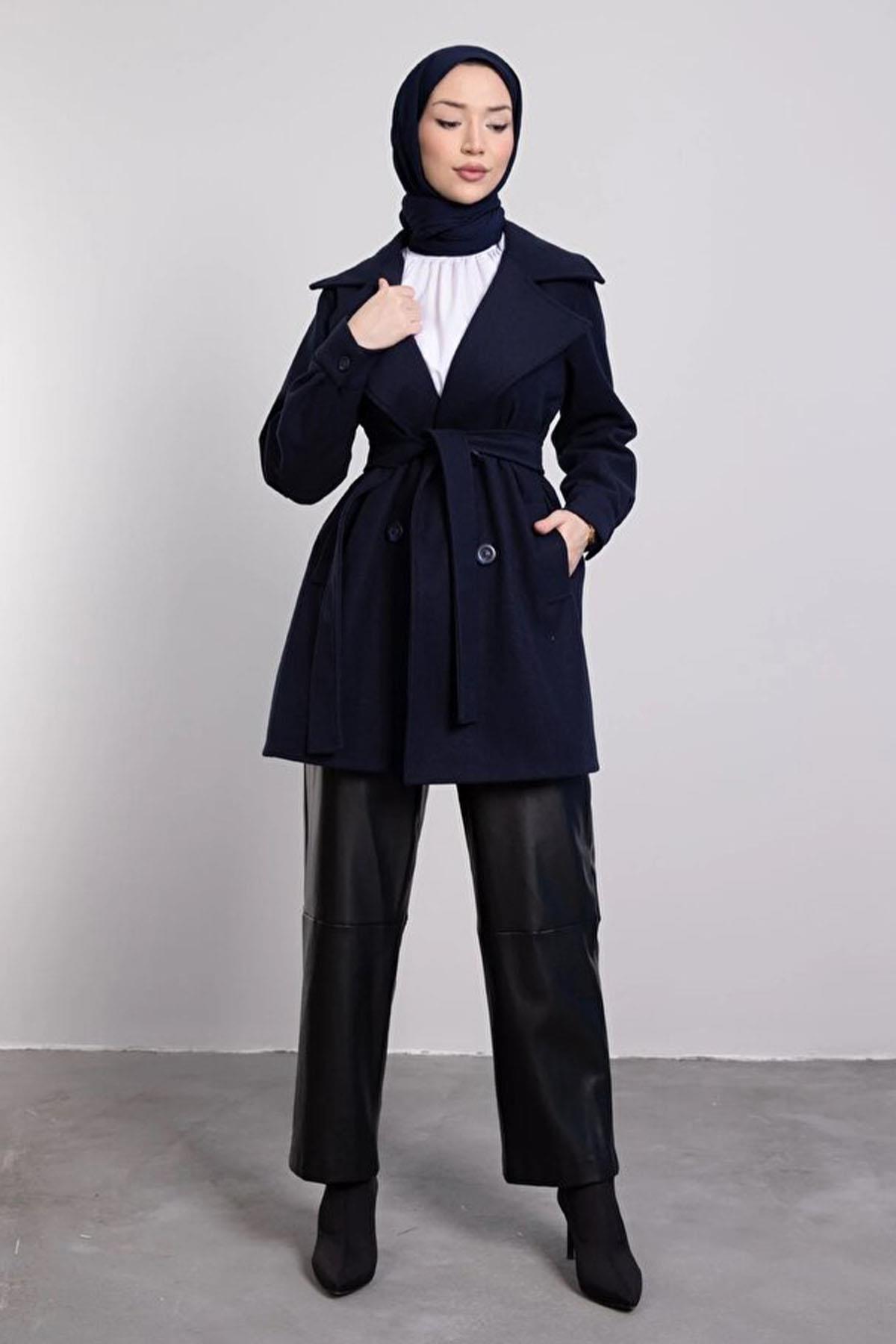 Kadın Nostaljik Geniş Yaka Kısa Kaşe Kaban-Lacivert