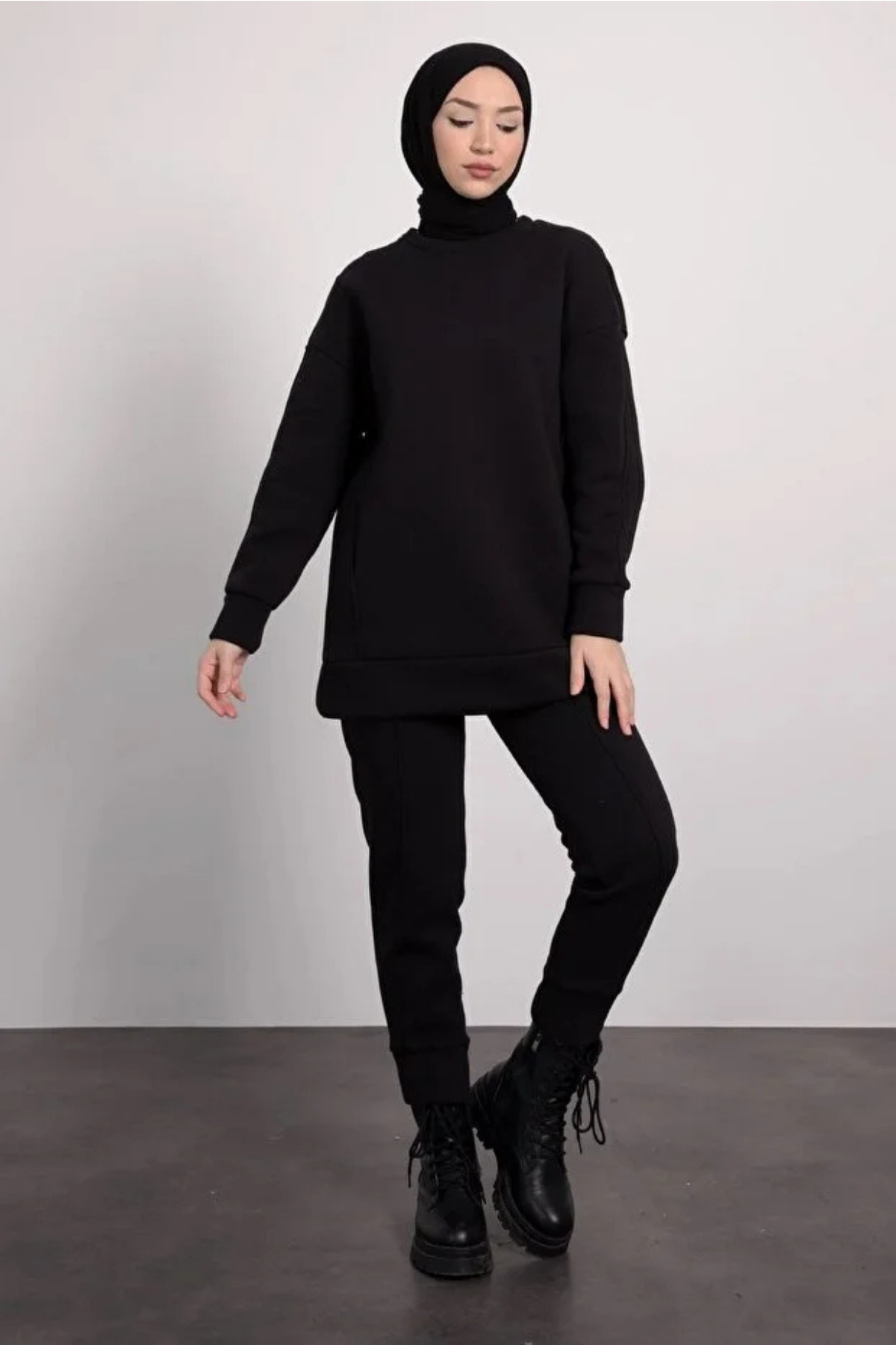 Kanguru Cepli İçi Polarlı Tesettür Takım- Siyah (TD256)