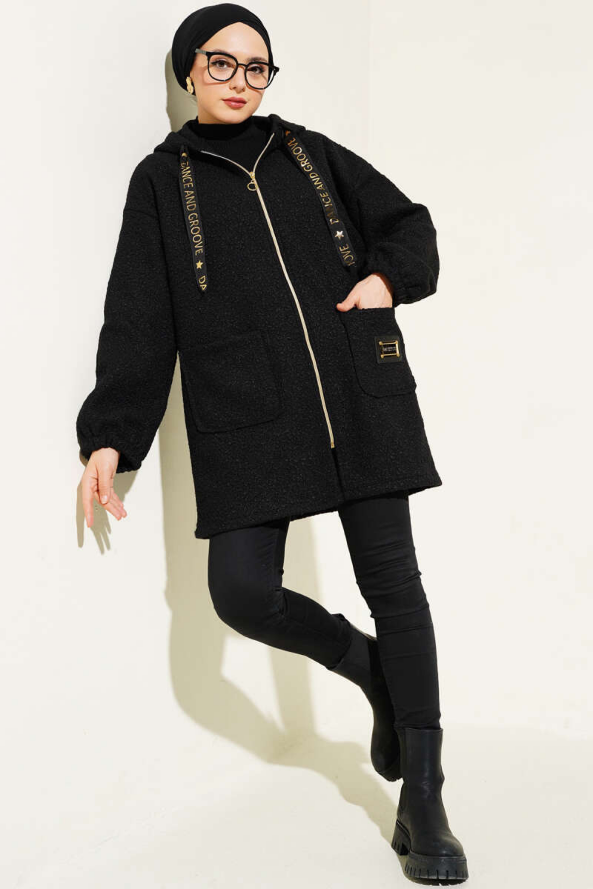 Kapüşonlu Fermuarlı Buklet Tesettür Kaban- Siyah (TD357)