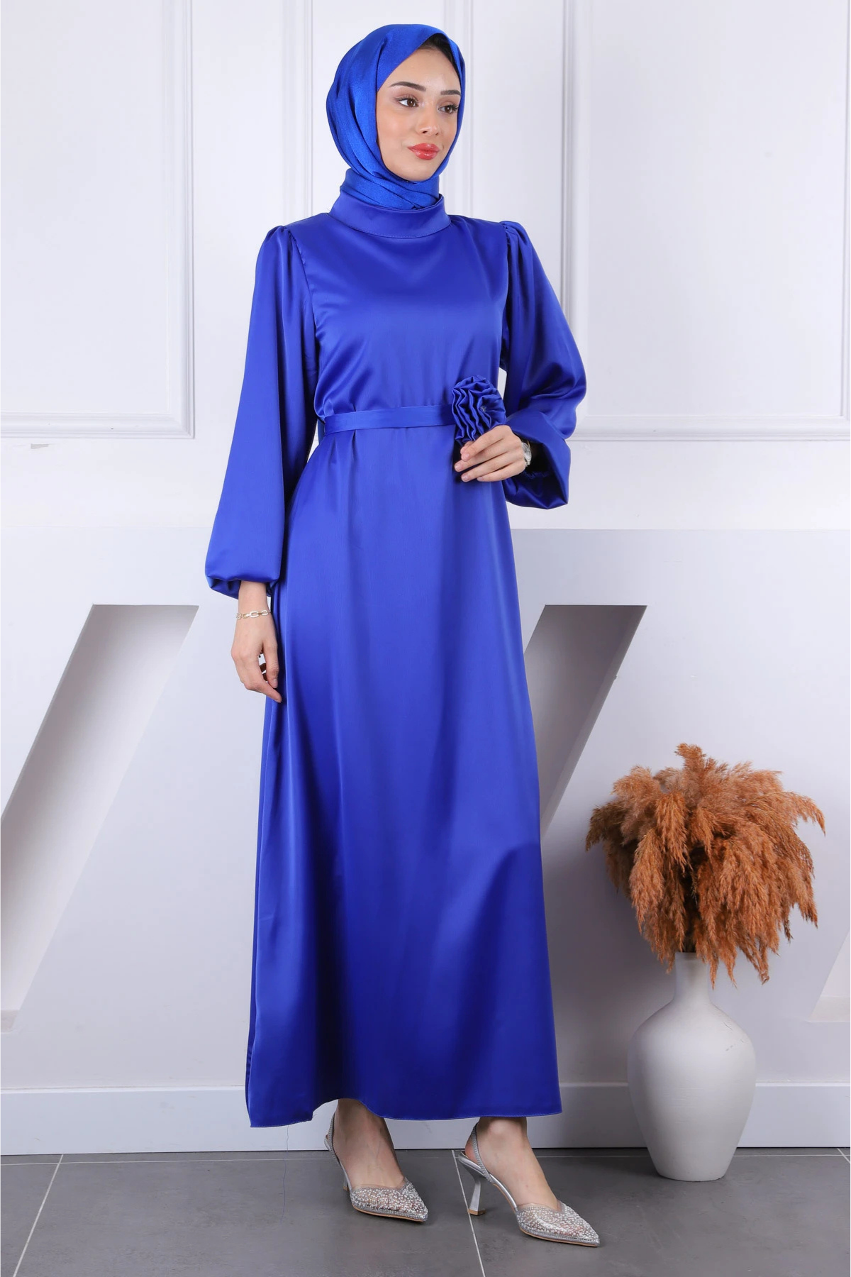Kemeri Gül Detaylı Saten Tesettür Abiye- Saks Mavi (TD288)