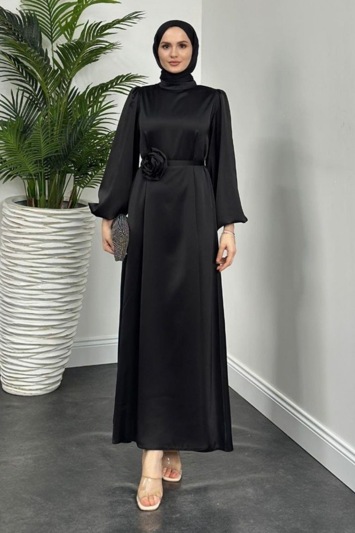Kemeri Gül Detaylı Saten Tesettür Abiye- Siyah