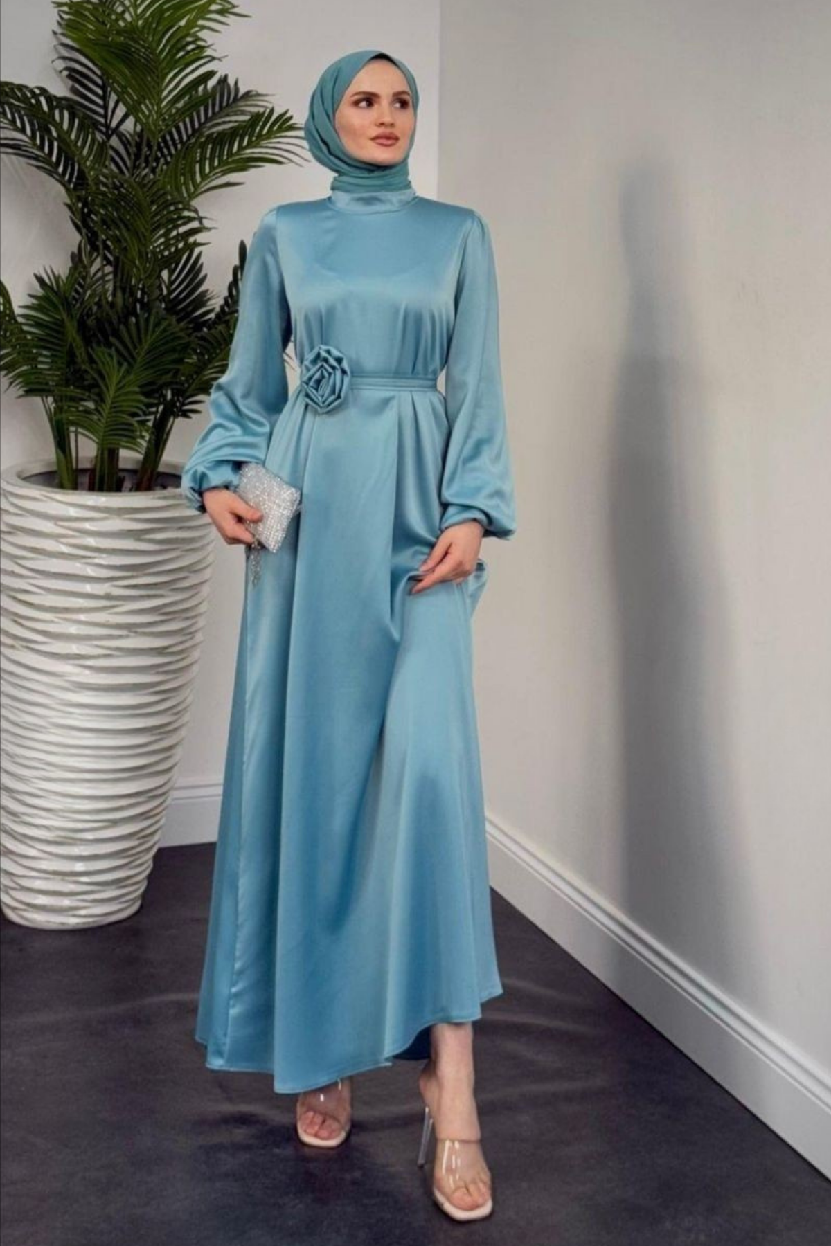 Kemeri Gül Detaylı Saten Tesettür Abiye- Siyah Kemeri Gül Detaylı Saten Tesettür Abiye- Turkuaz Kemeri Gül Detaylı Saten Tesettür Abiye- Bej Kemeri Gül Detaylı Saten Tesettür Abiye- Saks Mavi