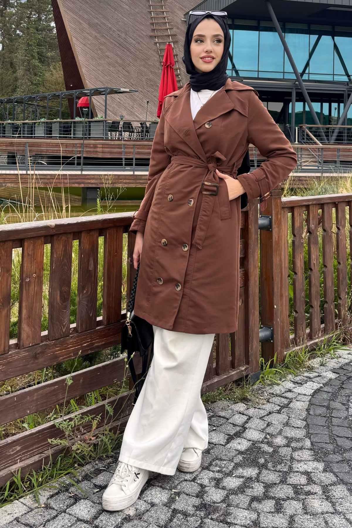 Kolu Kemer Detaylı Trenç -Kahverengi