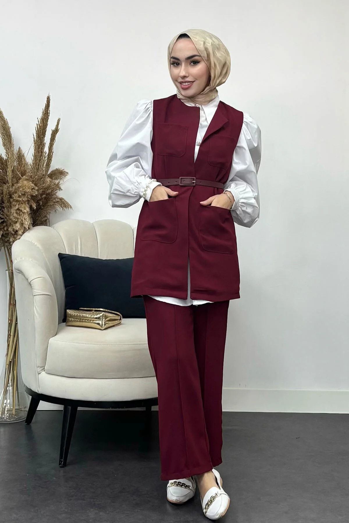 Krep Kumaş Kemerli Yelekli Tesettür Takım- Bordo (TD233)