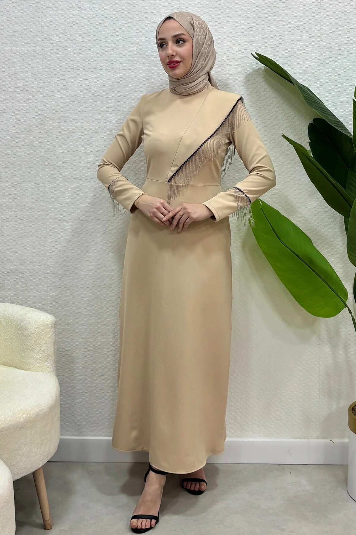 Krep Kumaş Zincirli Detaylı Tesettür Abiye- Bej (TD224)