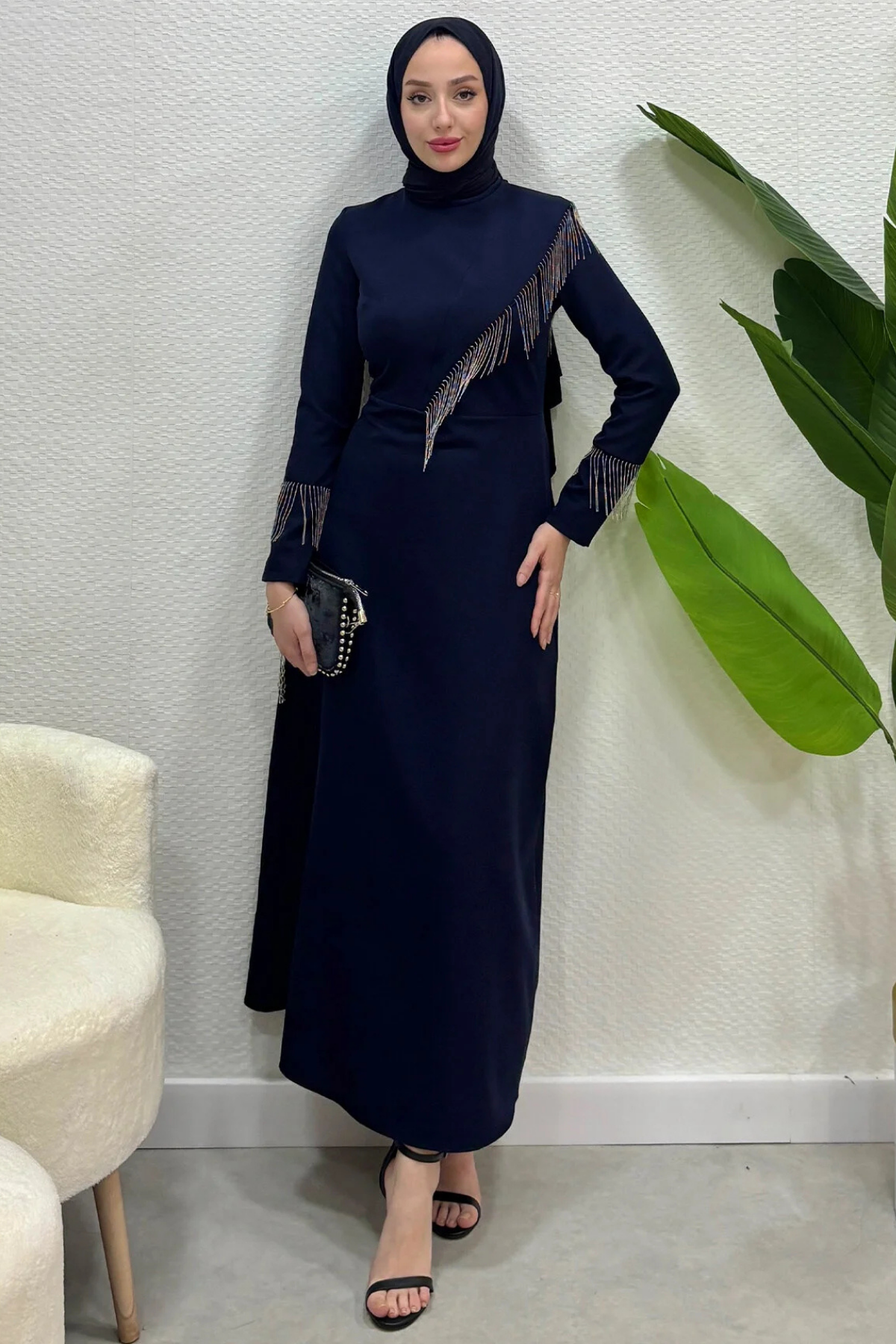 Krep Kumaş Zincirli Detaylı Tesettür Abiye- Lacivert (TD224)