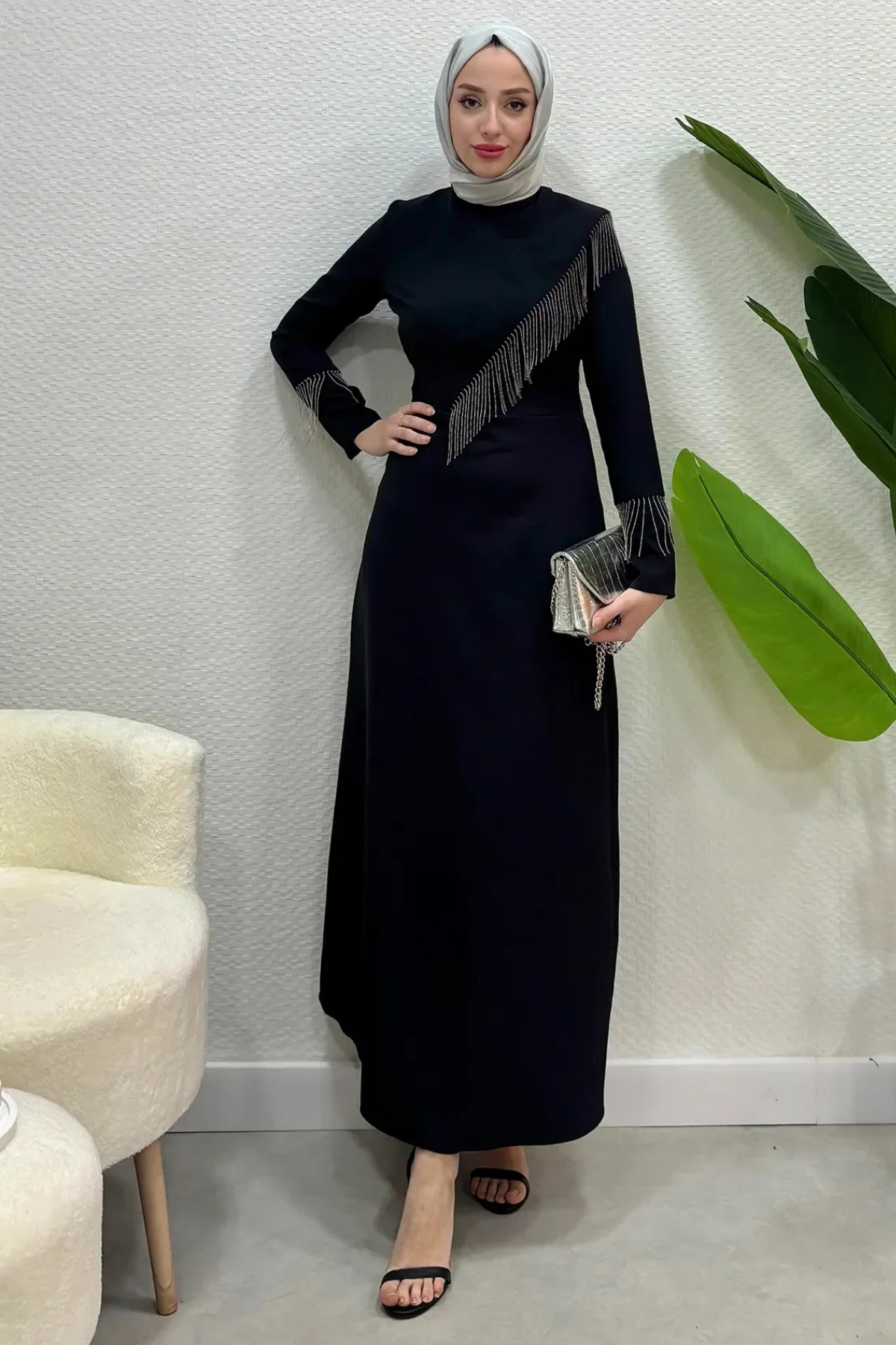 Krep Kumaş Zincirli Detaylı Tesettür Abiye- Siyah