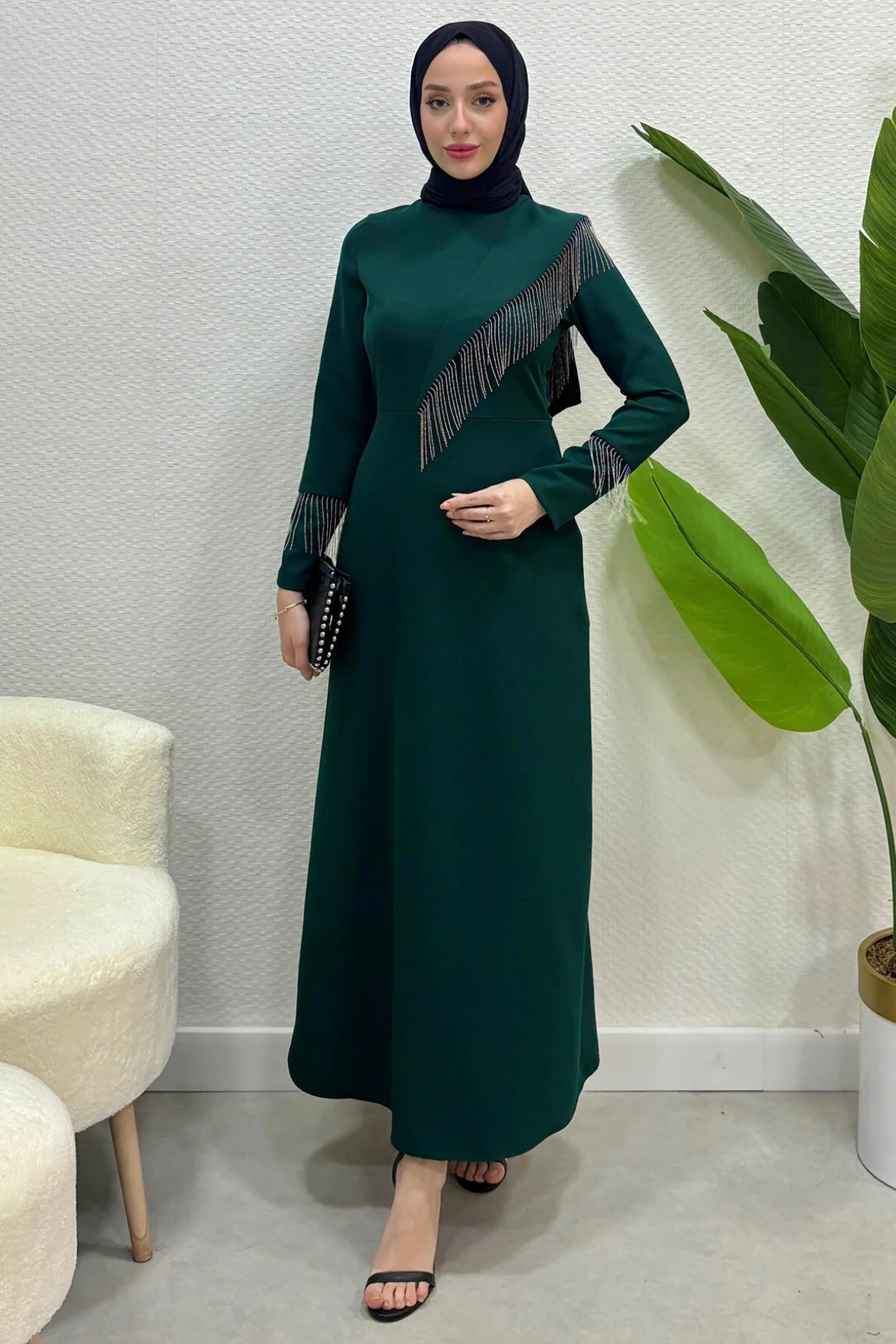 Krep Kumaş Zincirli Detaylı Tesettür Abiye- Zümrüt (TD224)