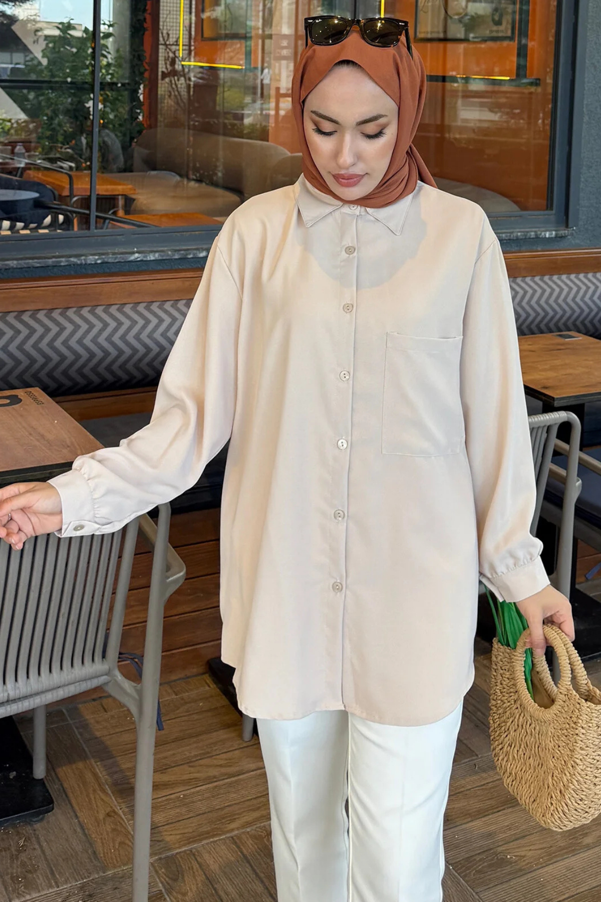 Linda Kumaş Cep Detaylı Tesettür Gömlek- Bej (TD208)