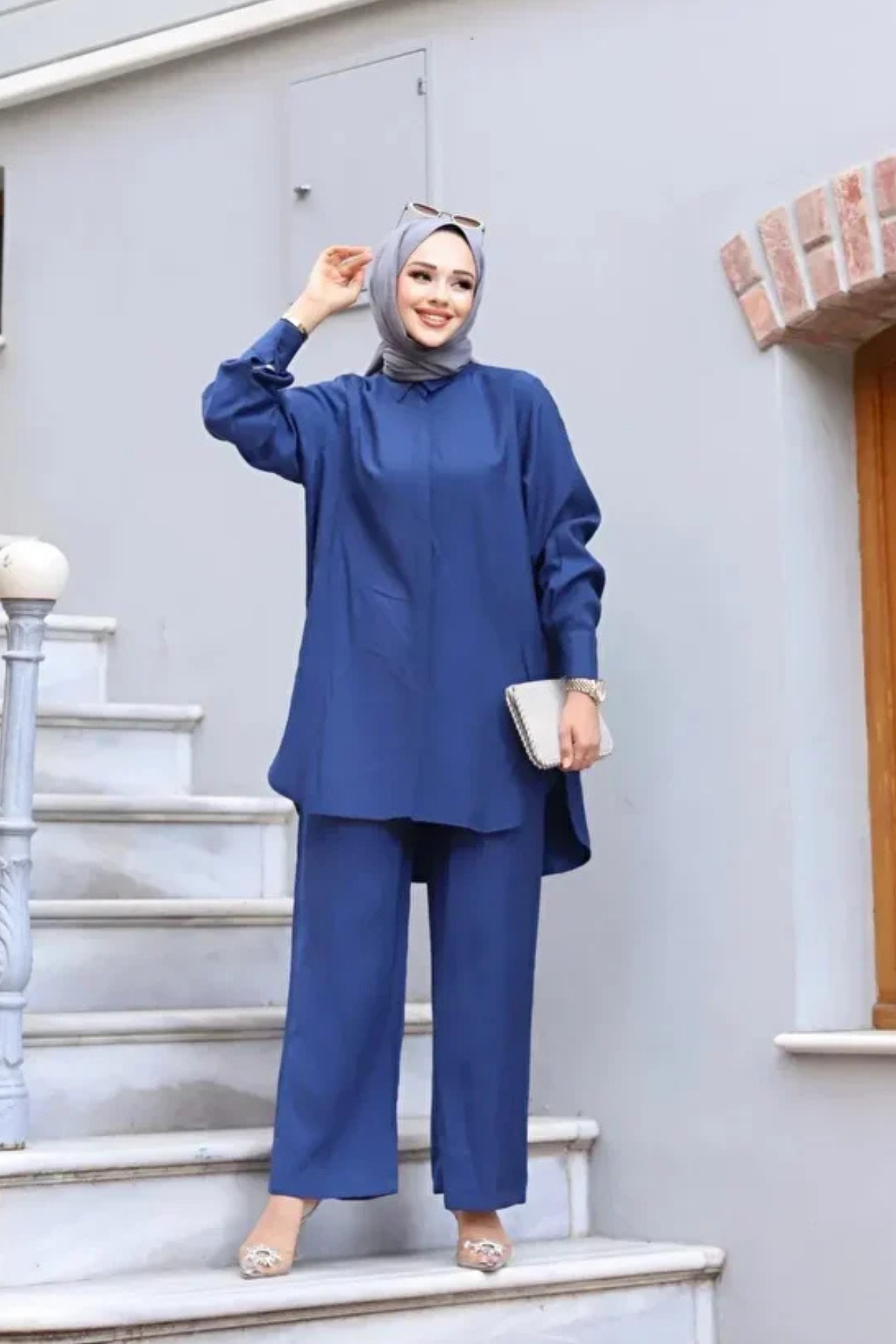 Modal Kumaş Gömlek Pantolon Oversize Tesettür Takım- Lacivert
