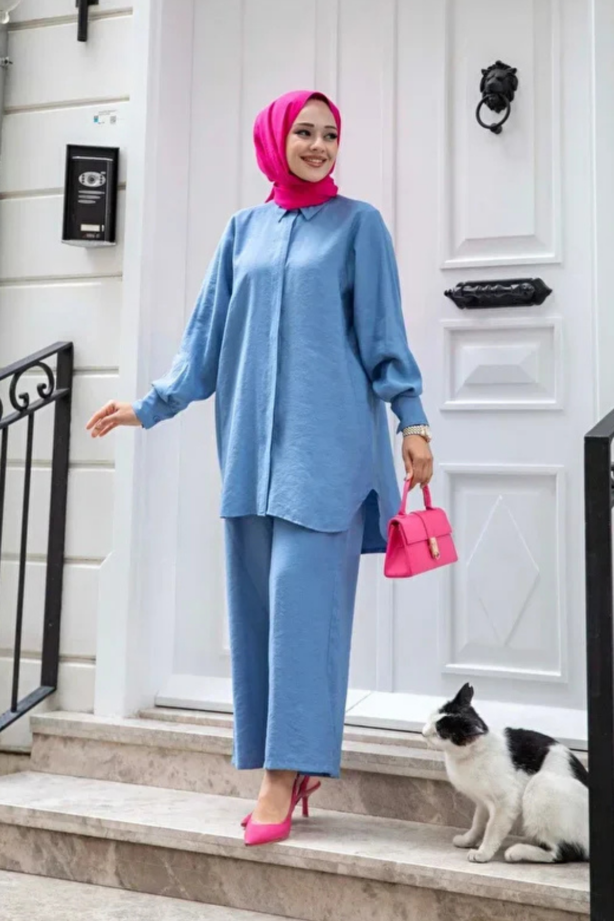 Modal Kumaş Gömlek Pantolon Oversize Tesettür Takım- Mavi (TD244)