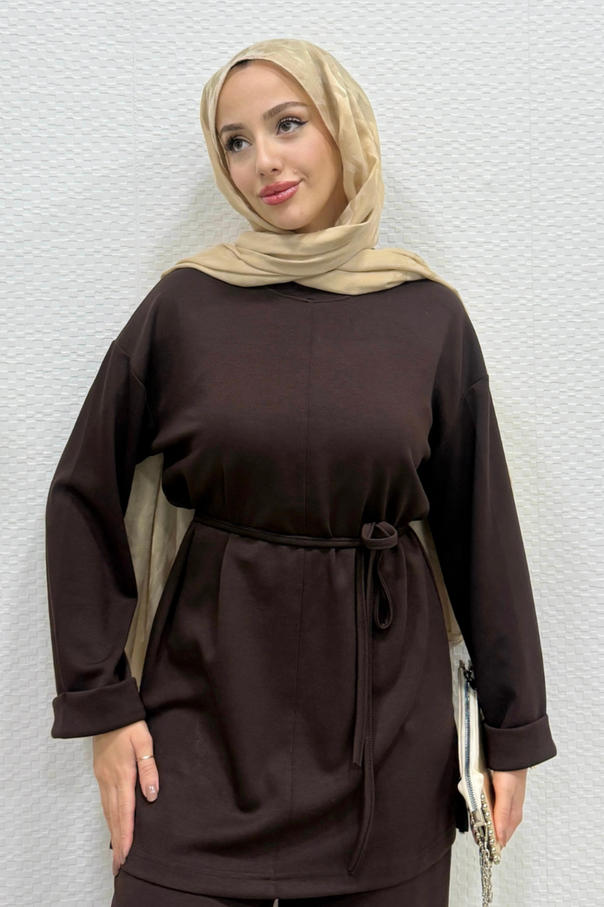 Modal Kumaş Kuşaklı Tesettür Tunik- Acı Kahve