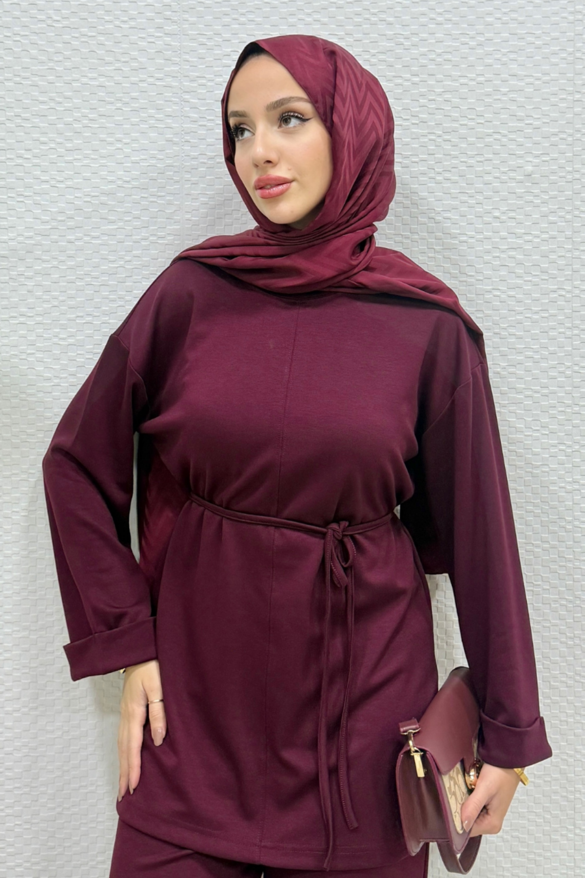 Modal Kumaş Kuşaklı Tesettür Tunik- Bordo