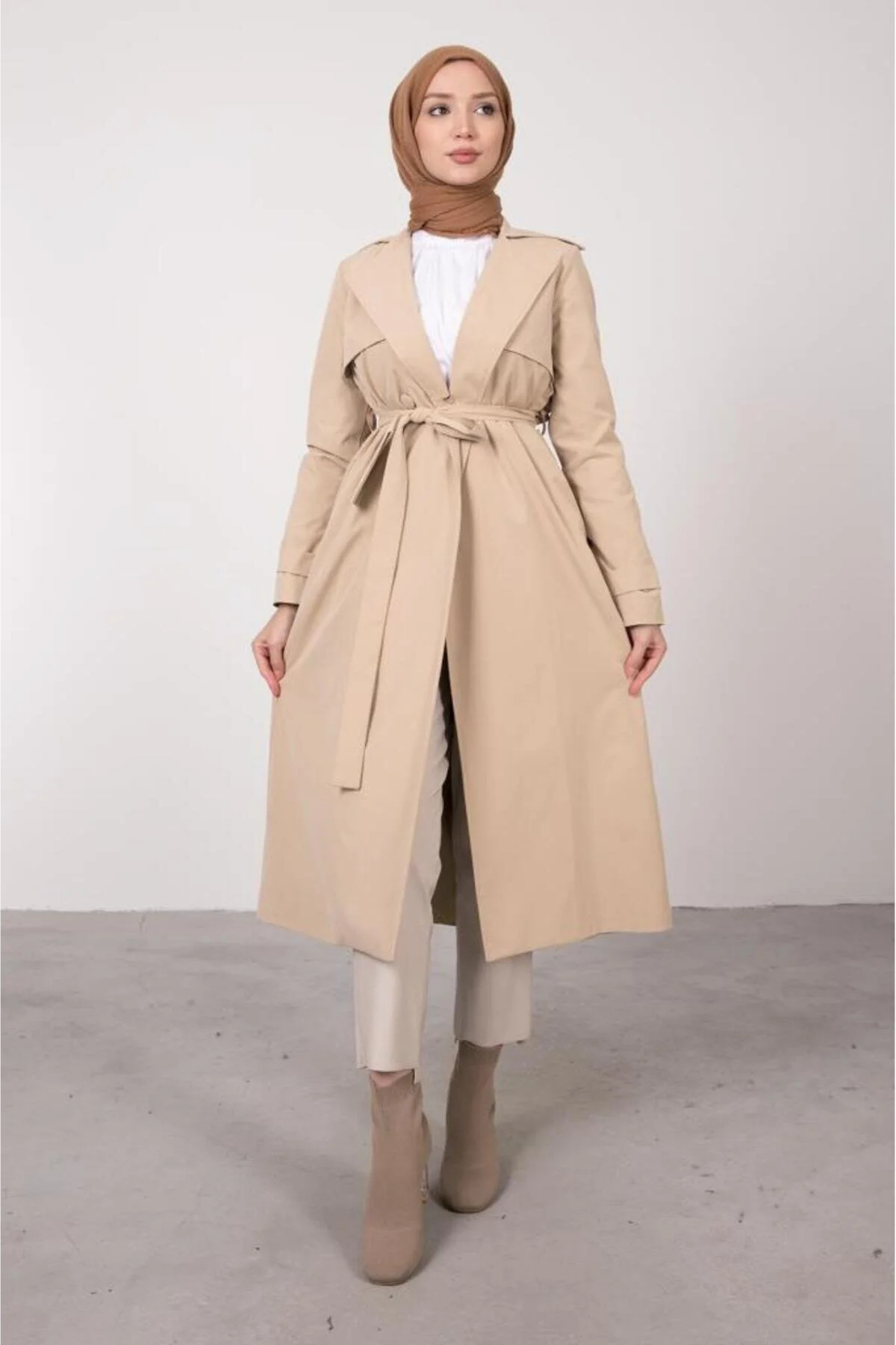 Ön Parçalı Kruvaze Yaka Kuşaklı Trençkot- Bej (TD198)