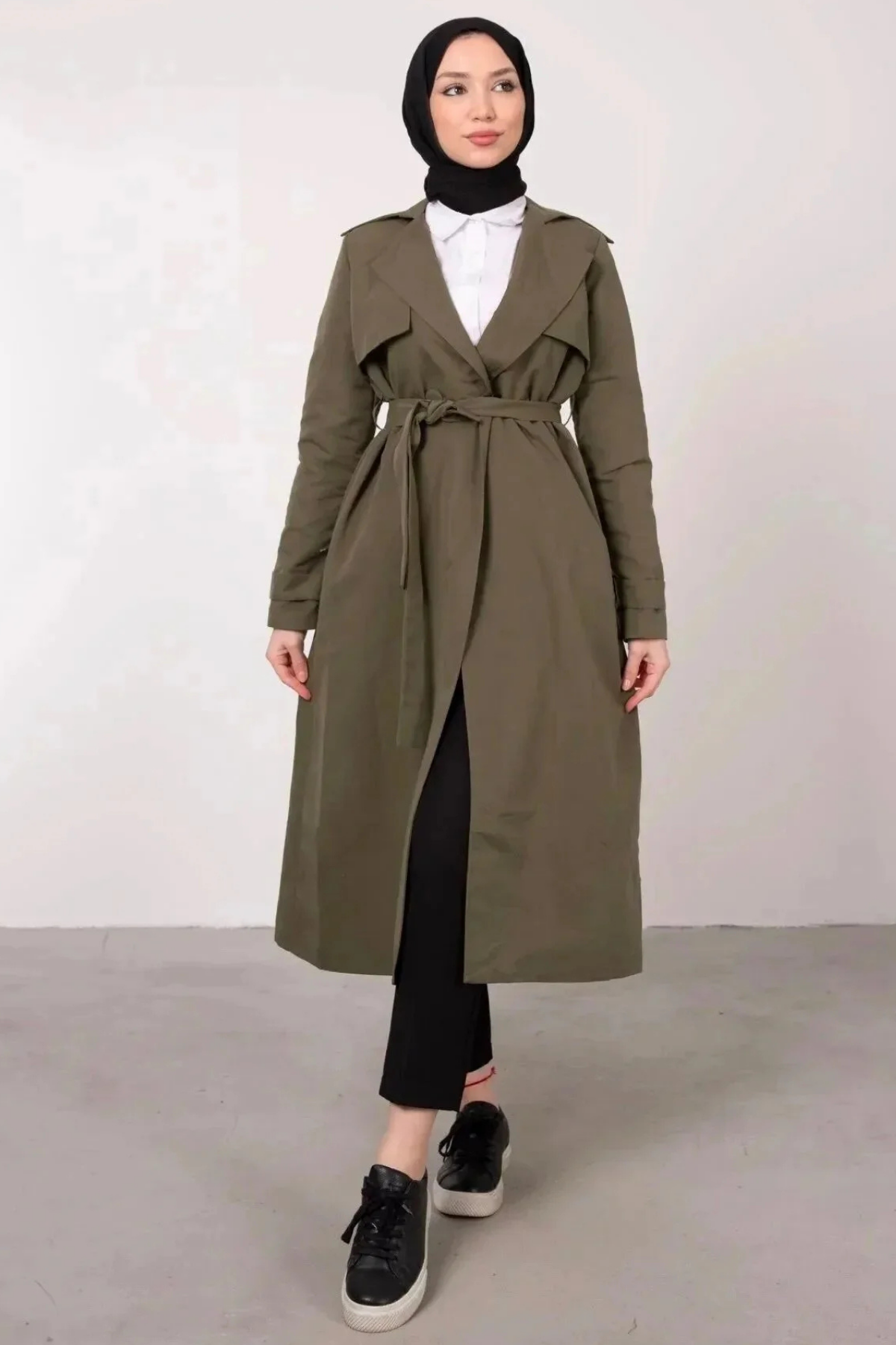Ön Parçalı Kruvaze Yaka Kuşaklı Trençkot- Haki (TD198)