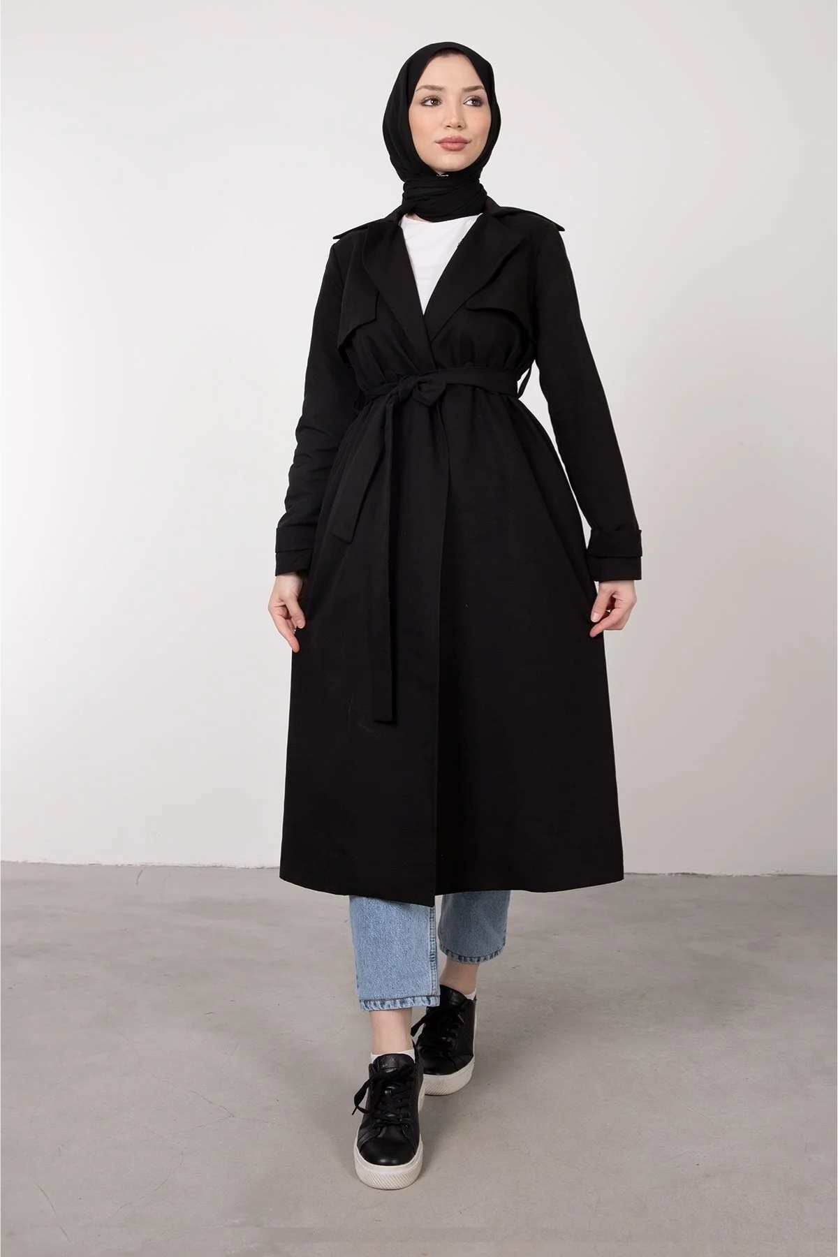 Ön Parçalı Kruvaze Yaka Kuşaklı Trençkot- Siyah (TD198)