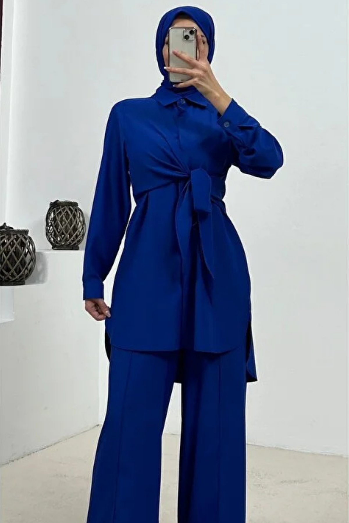 Önden Bağlamalı Medine Kumaş Çımalı Pantolon Tunik Tesettür Takım- Saks Mavi (TD243)