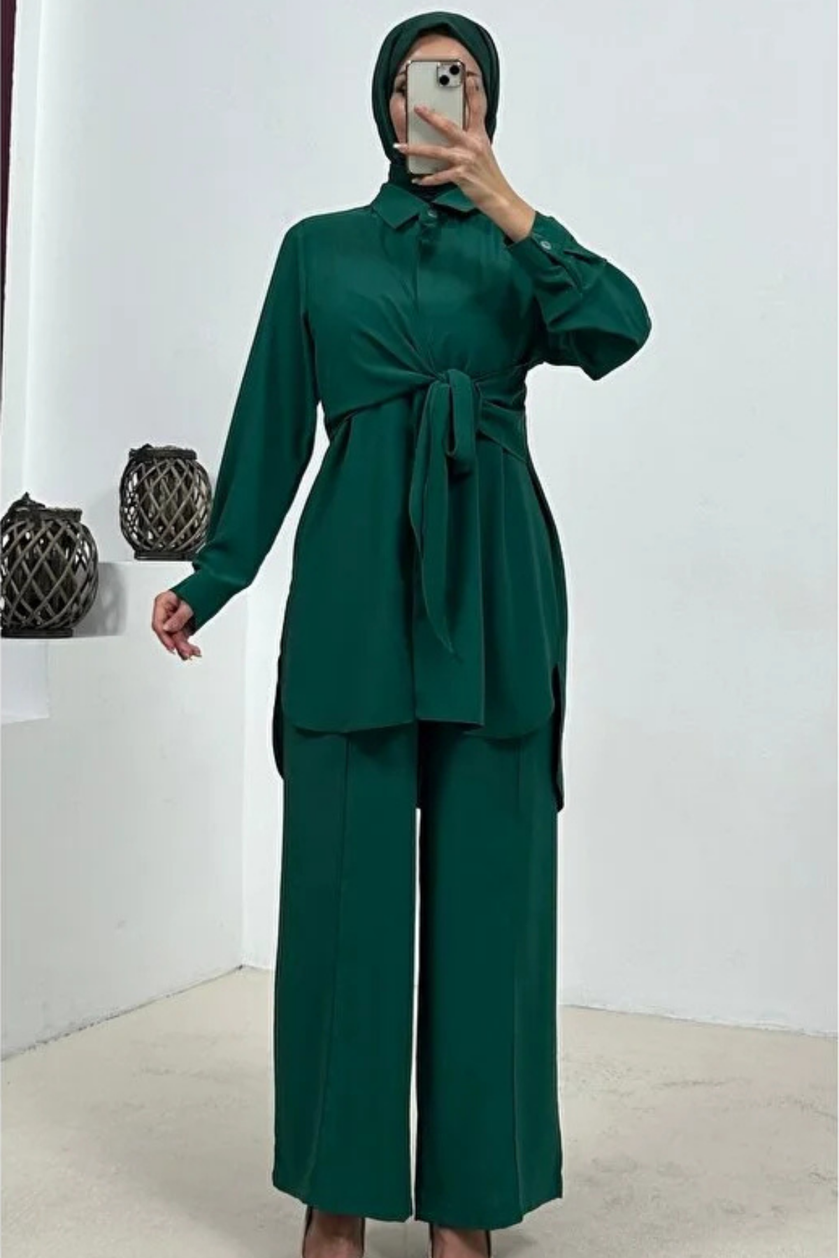 Önden Bağlamalı Medine Kumaş Çımalı Pantolon Tunik Tesettür Takım- Zümrüt (TD243)