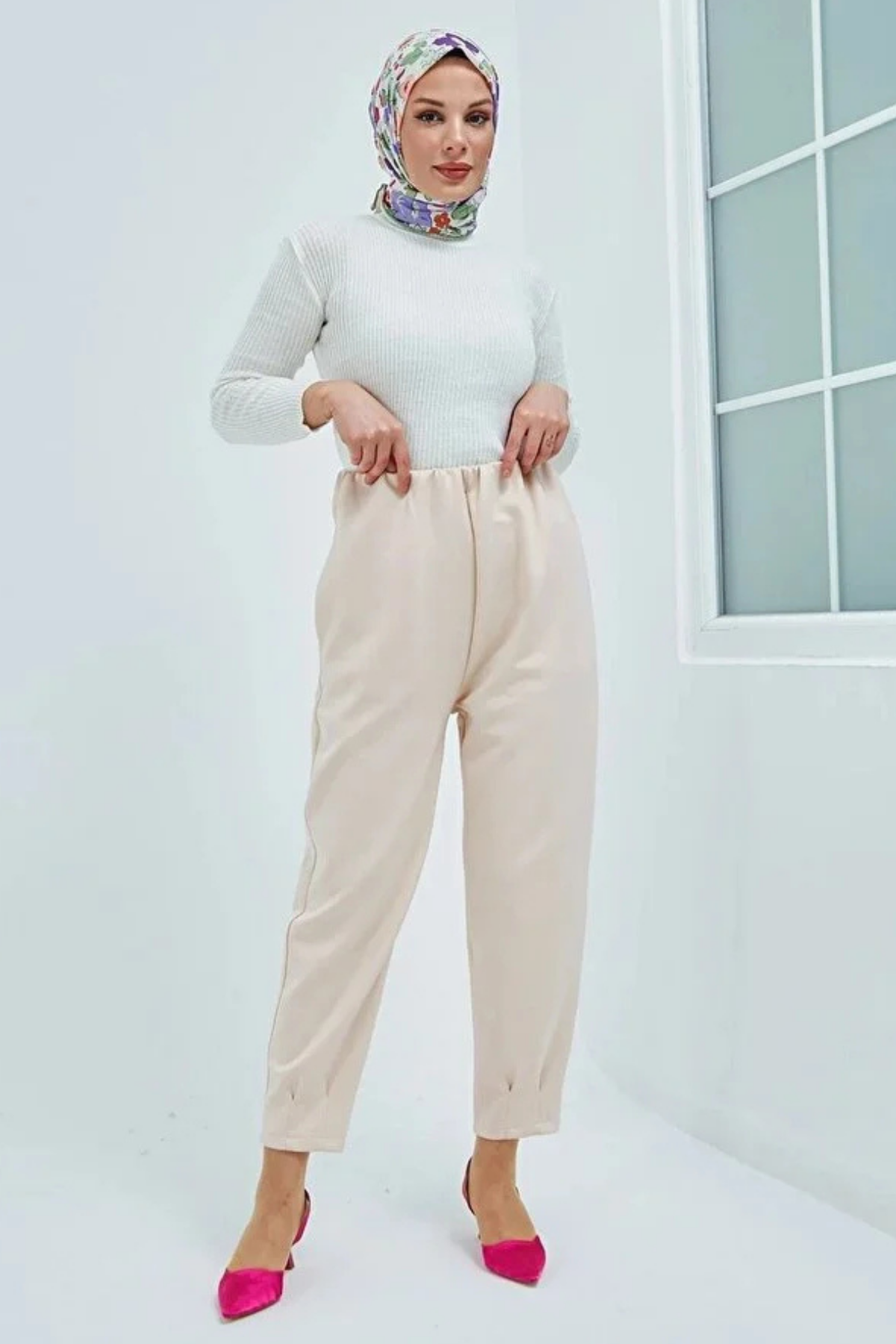Paça Pile ve Bel Detay Scuba Kumaş Pantolon- Bej (TD210)