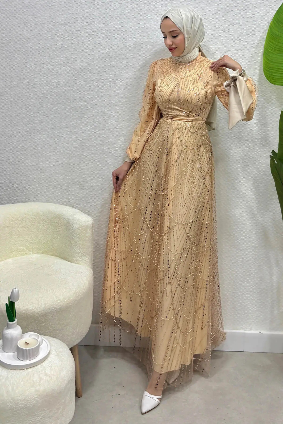 Prenses Model Taş İşlemeli Tesettür Abiye- Bej (TD216)