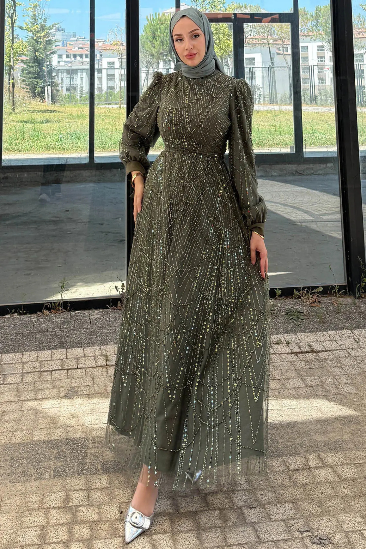 Prenses Model Taş İşlemeli Tesettür Abiye- Haki (TD216)