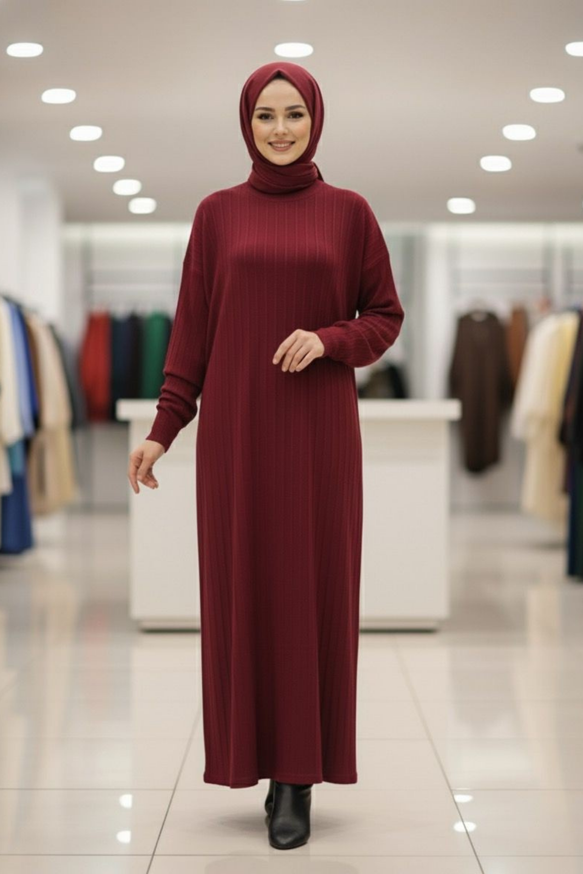 Rona Mevsimlik Fitilli Triko Elbise- Bordo Standart (36-42 Uyumlu) (TD278)