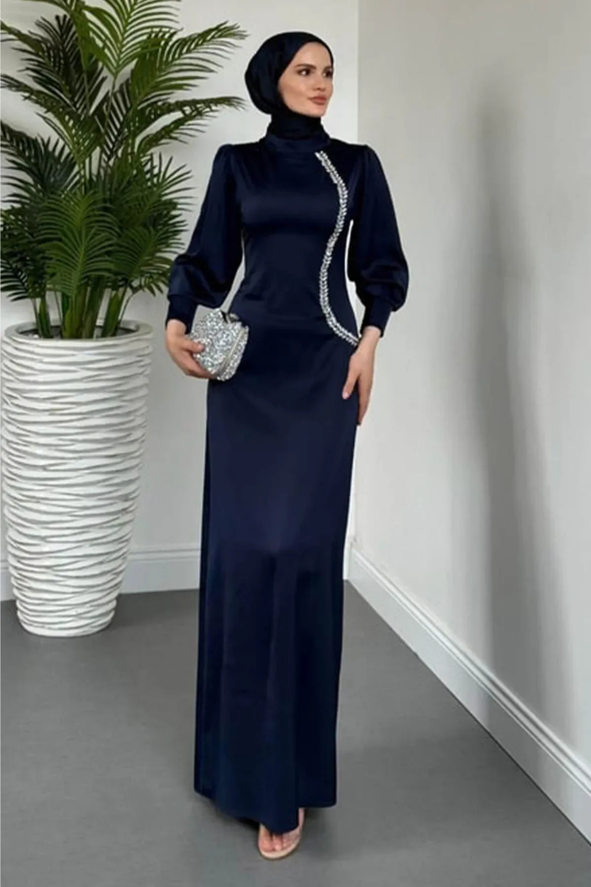 Saten Yandan Taşlı Kalem Abiye- Lacivert (TD203)