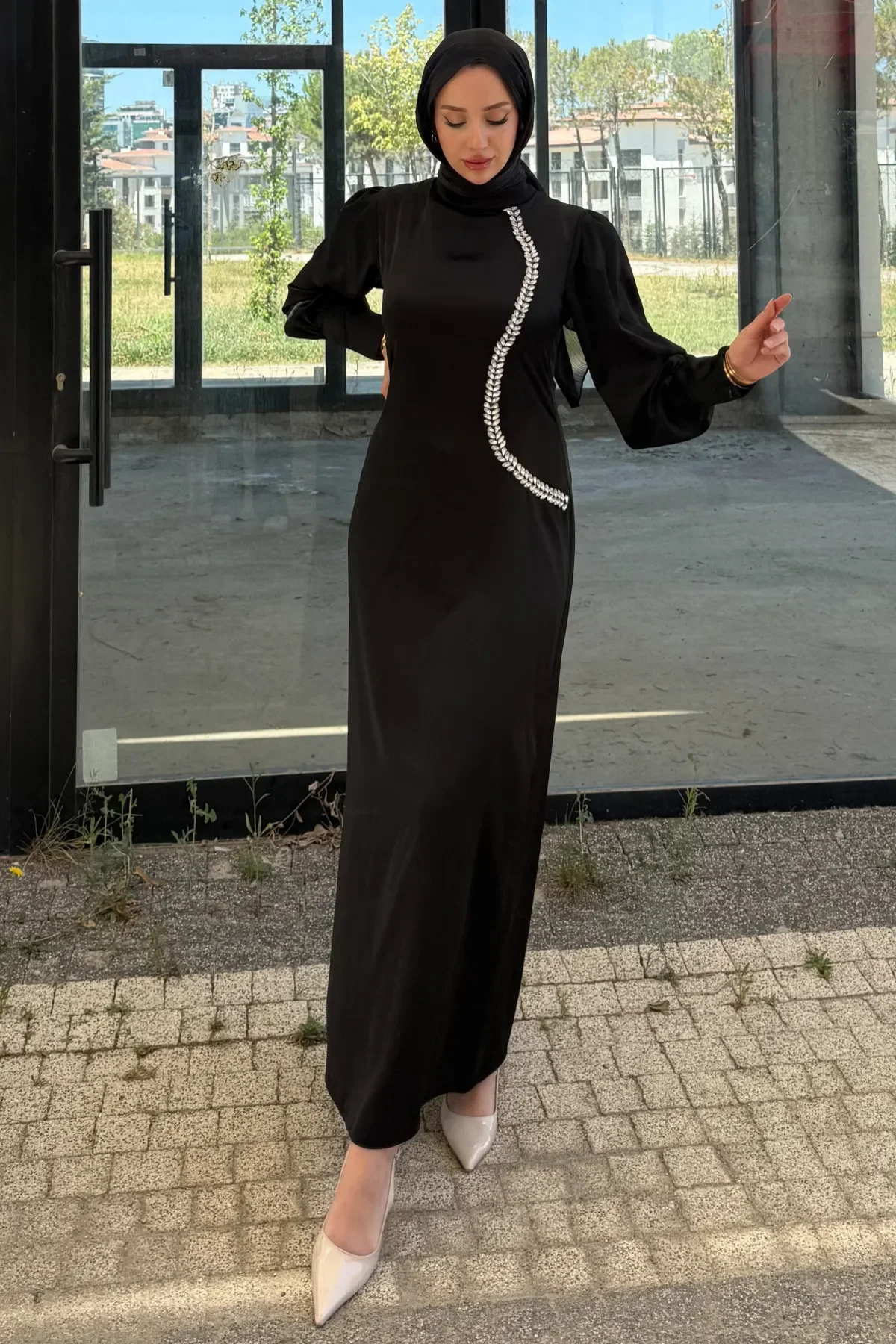 Saten Yandan Taşlı Kalem Abiye- Siyah (TD203)
