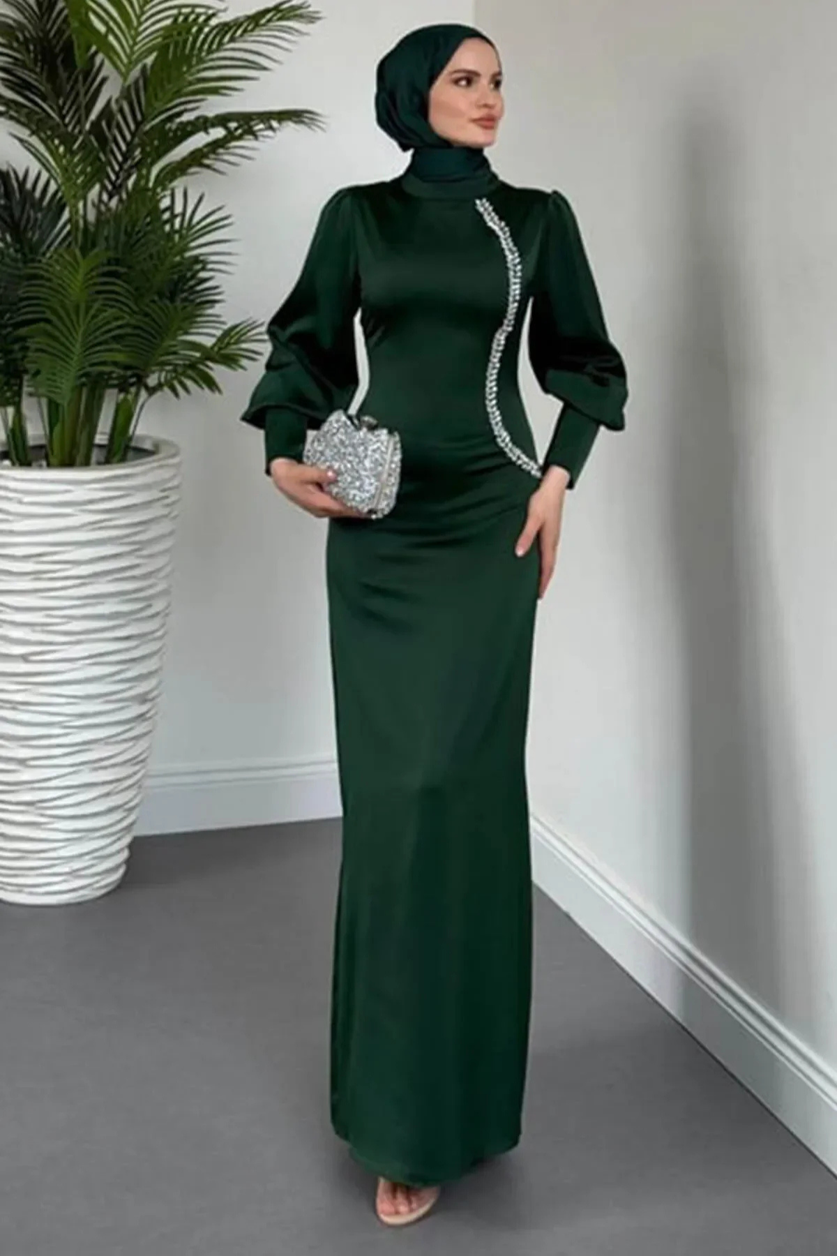 Saten Yandan Taşlı Kalem Abiye- Zümrüt
