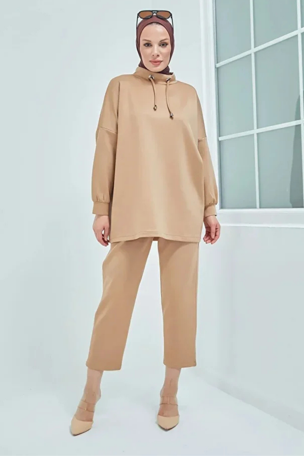 Scuba Kumaş Bağcıklı Alt Üst Tesettür Takım- Taba (TD211)