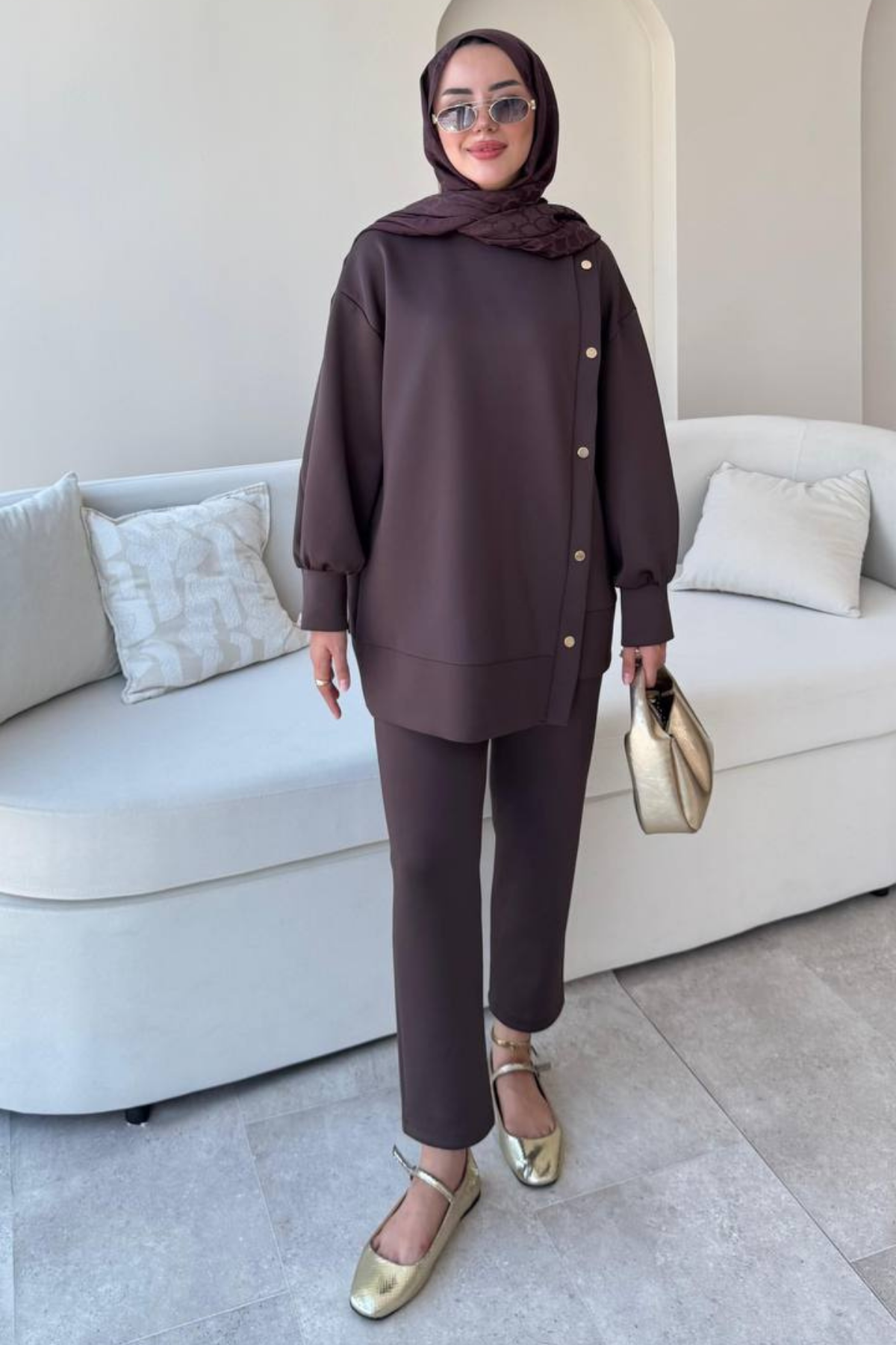 Scuba Yandan Çıtçıtlı Tesettür Takım- Acı Kahve