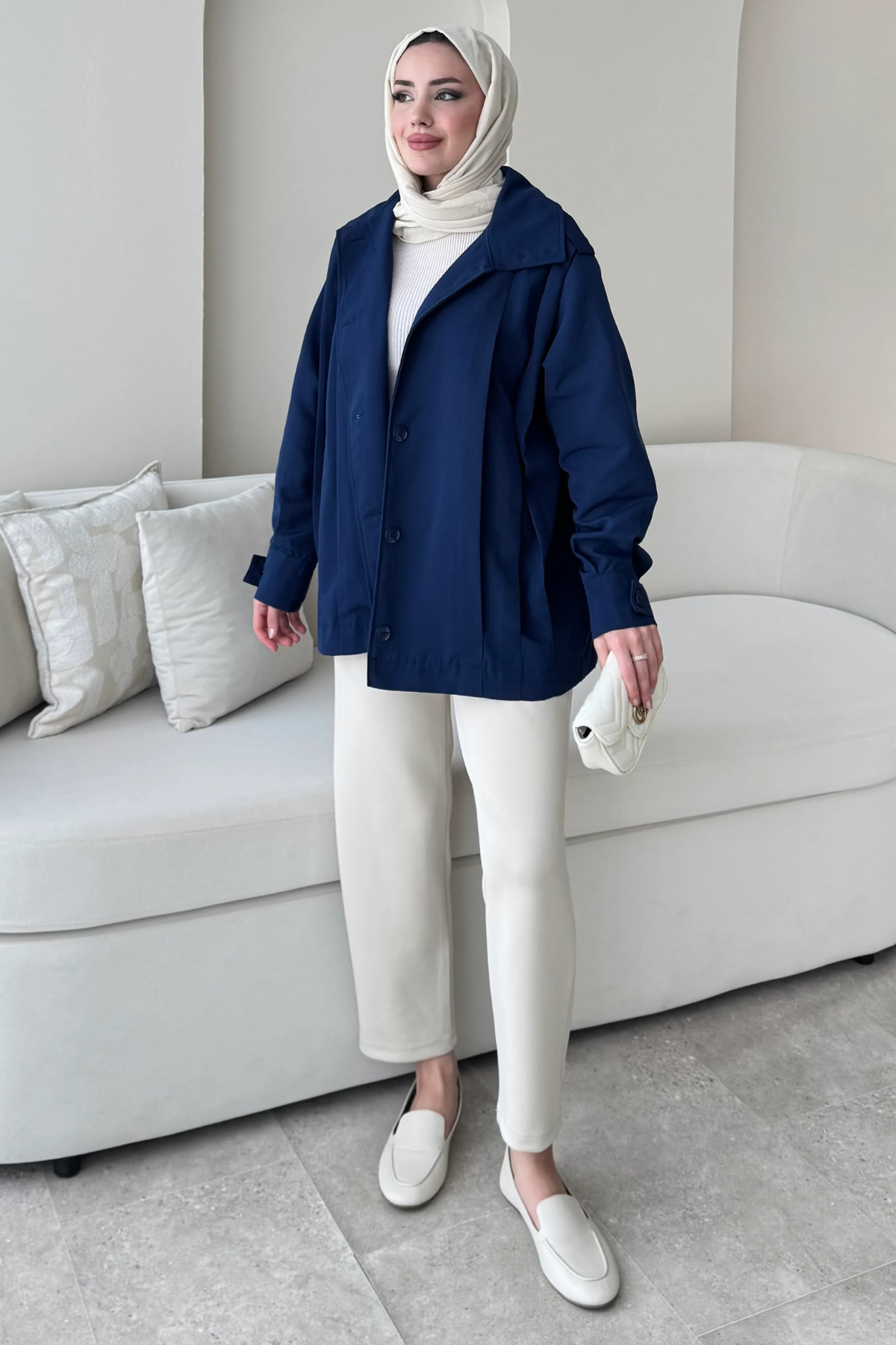 Şerit Detaylı Astarsız Carla Trençkot Standart Beden- Lacivert (36-42 Uyumludur)