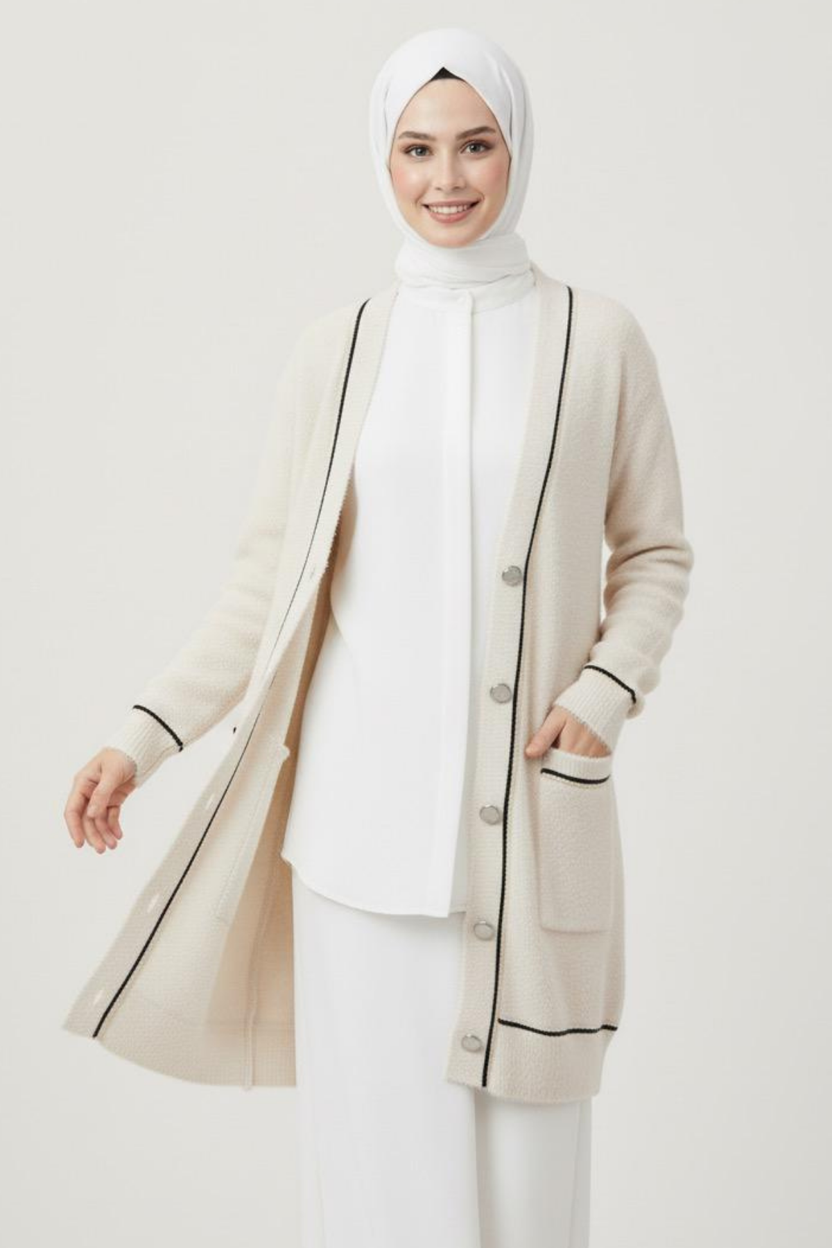Şerit Detaylı V Yaka Peluş Düğmeli Tesettür Hırka- Beyaz Standart Beden (36-42 Uyumlu) (TD238)