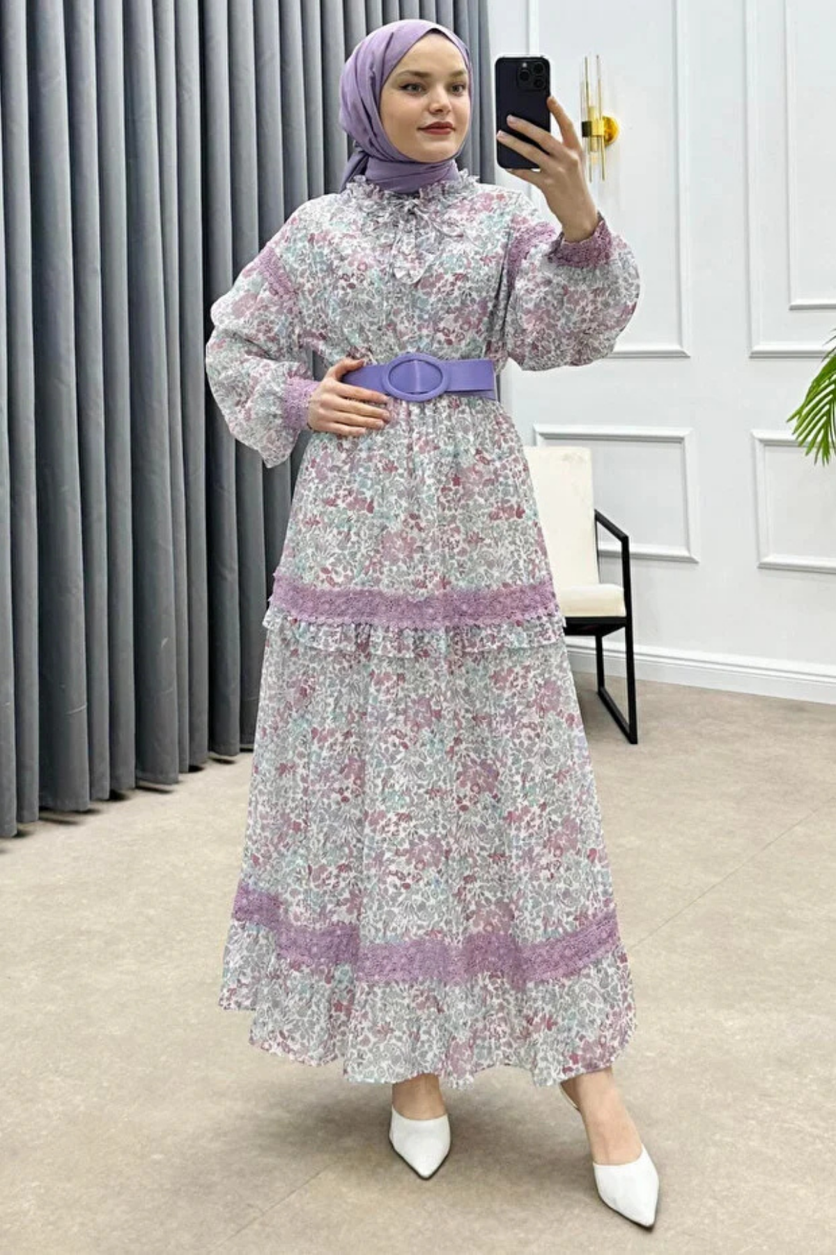 Seyyar Kemerli Çiçekli Şifon Tesettür Elbise- Lila (TD249)