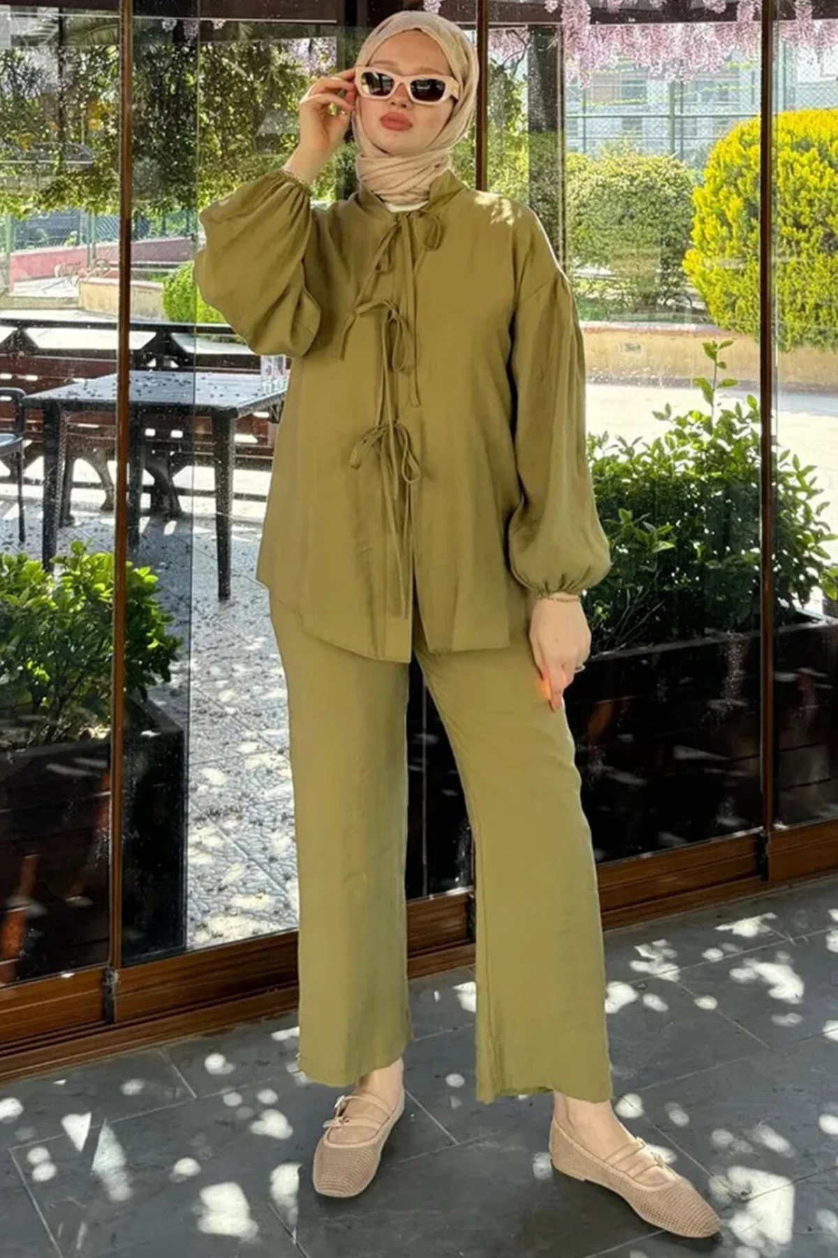 Tansel Kumaş Fiyonk Bağlamalı Tesettür Takım- Yağ Yeşili