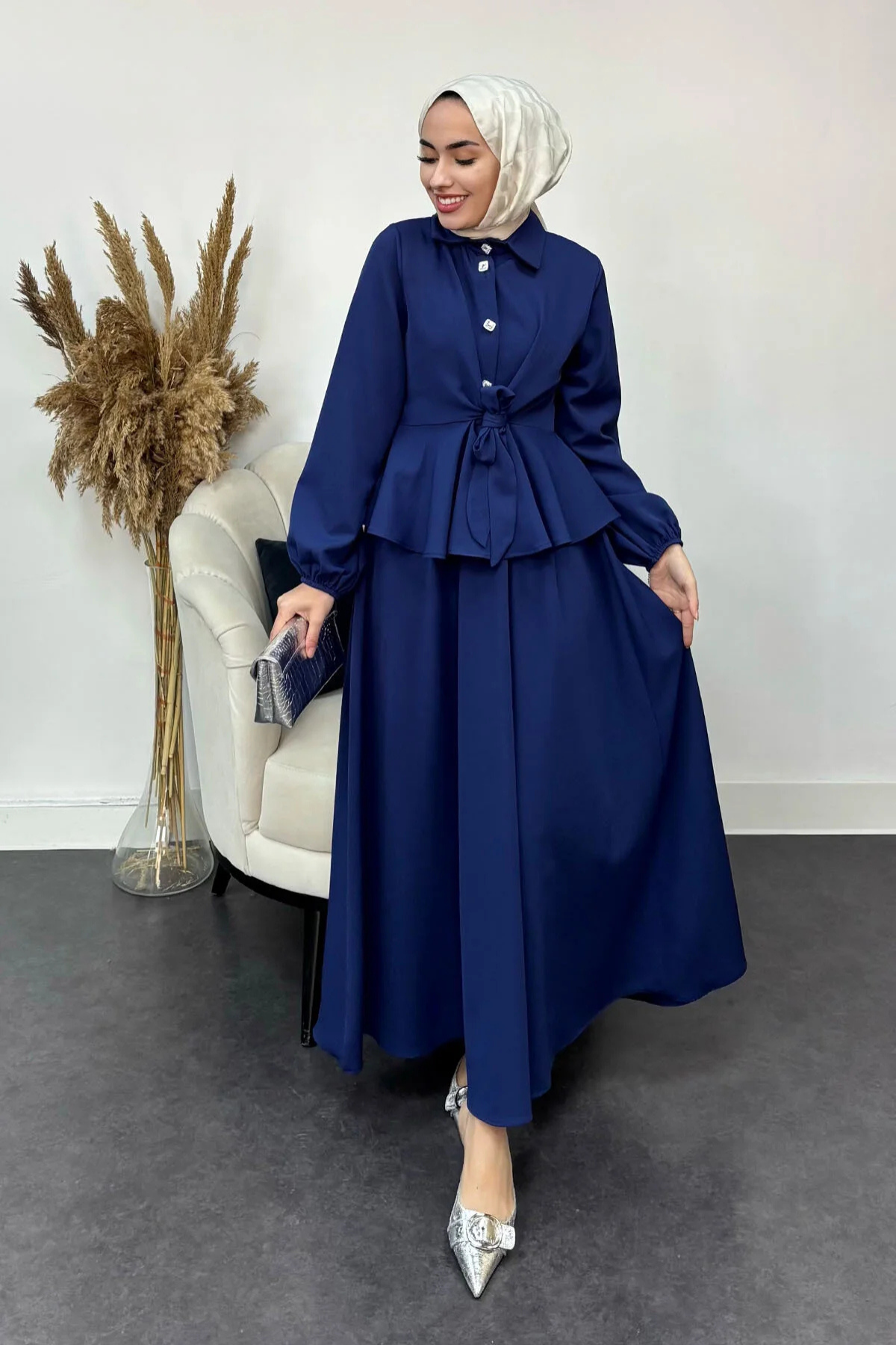 Taş Düğme Detaylı Krep Tesettür Takım- Lacivert
