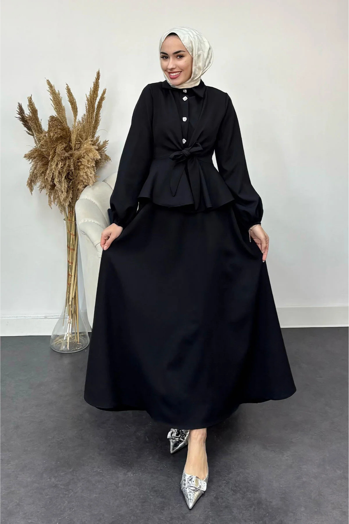 Taş Düğme Detaylı Krep Tesettür Takım- Siyah (TD270)
