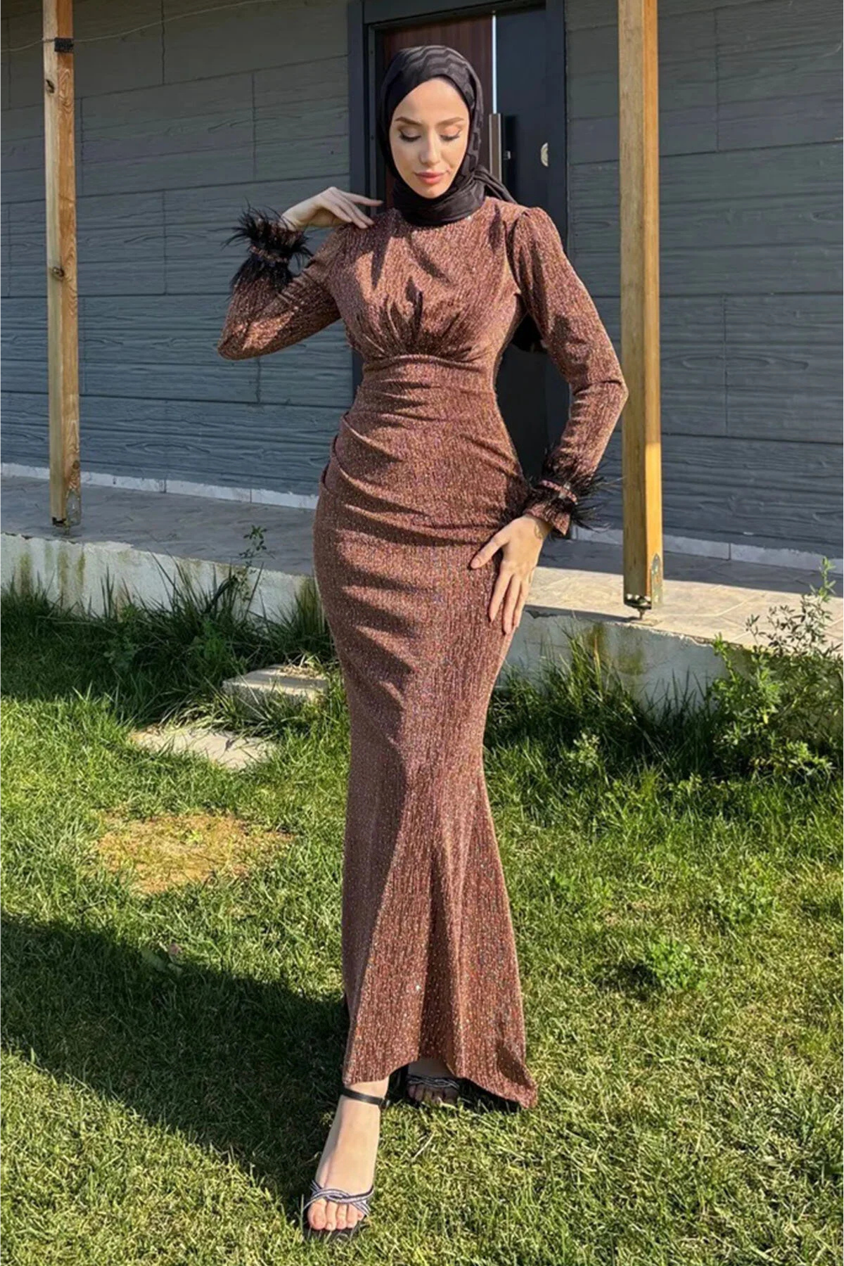 Tüy Detaylı Parıltılı Tesettür Abiye- Kahverengi
