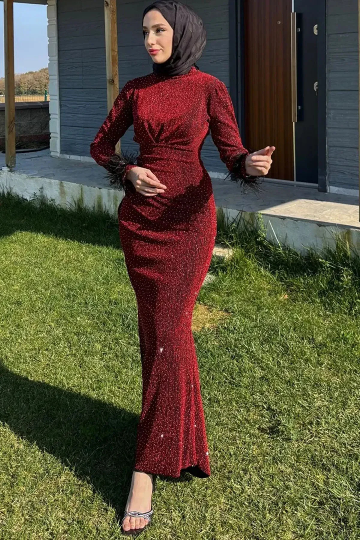 Tüy Detaylı Parıltılı Tesettür Abiye- Kırmızı