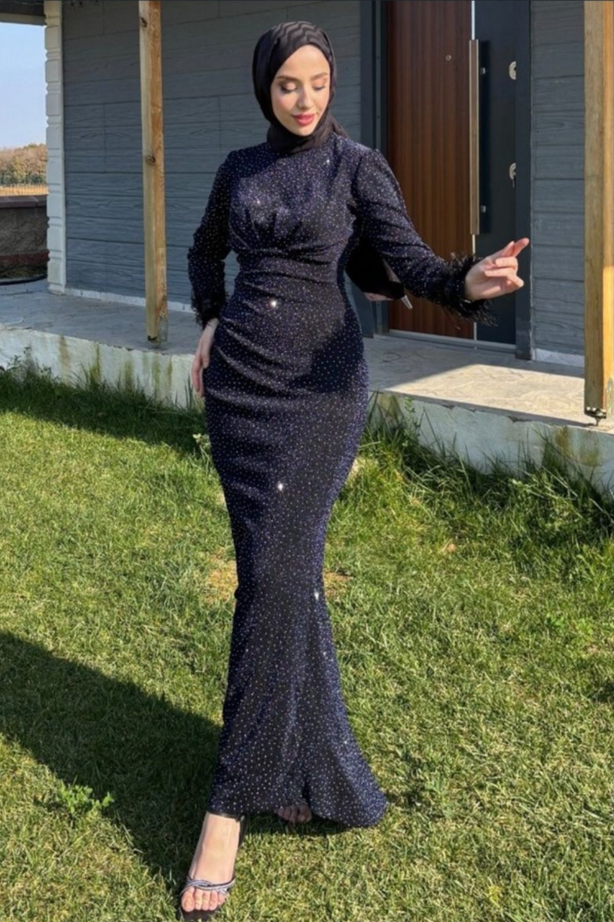 Tüy Detaylı Parıltılı Tesettür Abiye- Lacivert