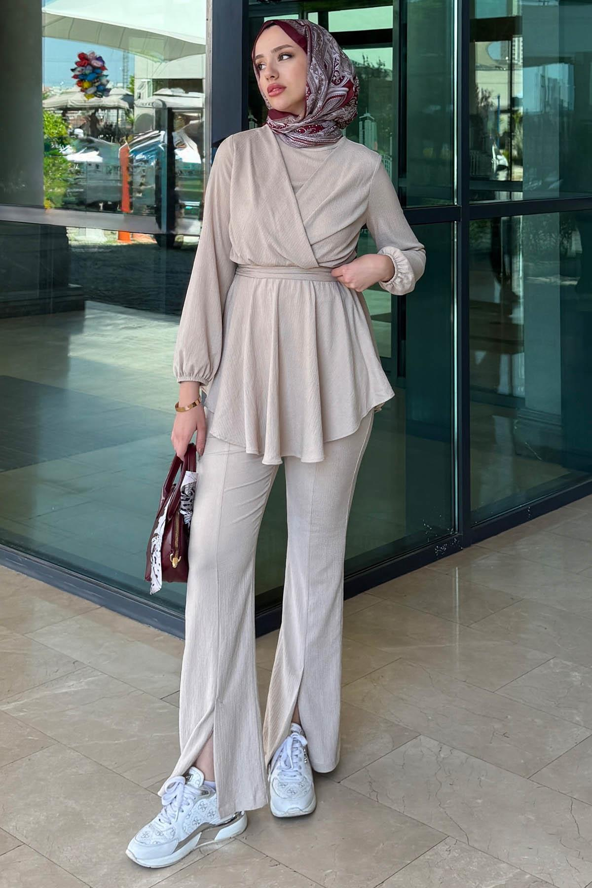 V Çapraz Bürümcük Kumaş Tesetür Takım - Bej