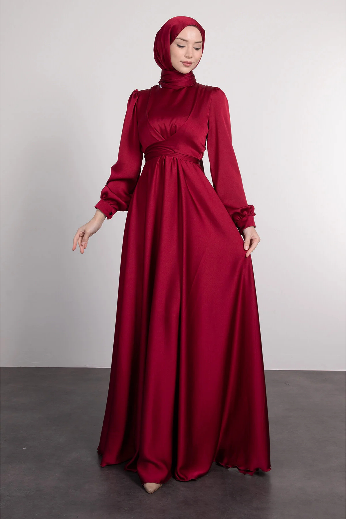 Yakadan Çaprazlı Bele Bağlamalı Tesettür Abiye- Bordo (TD257)