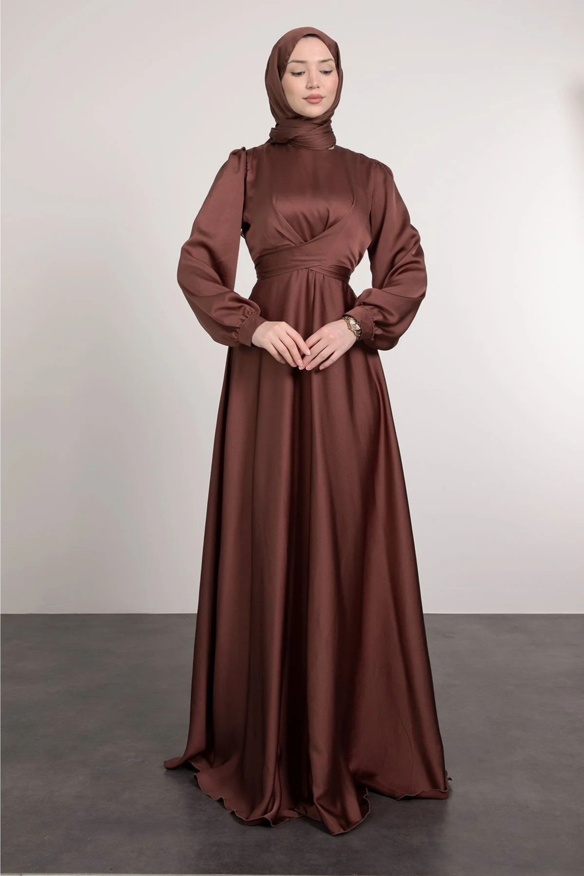 Yakadan Çaprazlı Bele Bağlamalı Tesettür Abiye- Kahverengi